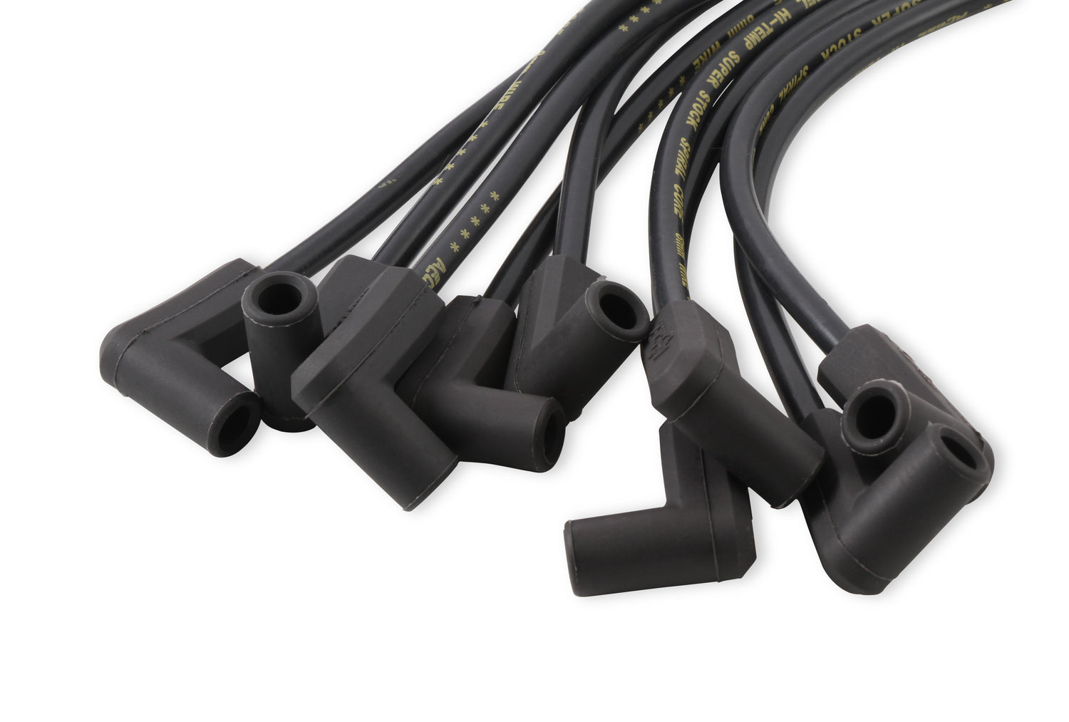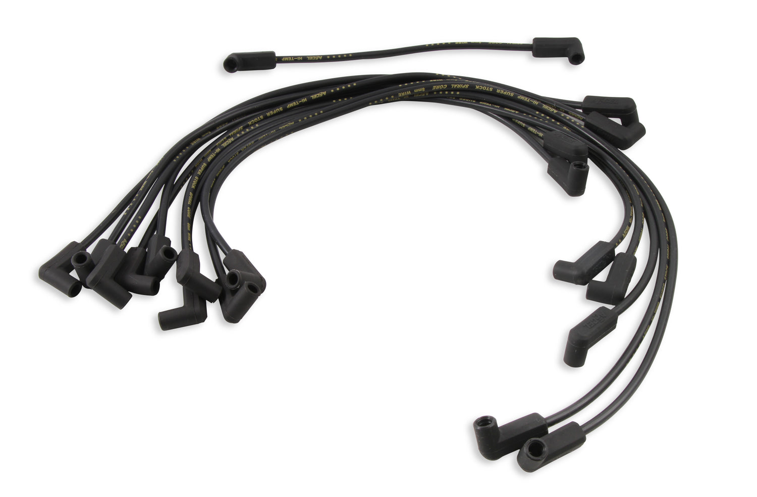 Custom Fit Super Stock Spiral Spark Plug Wire Set; Black; 8mm; Spiral Core; 500 Ohms Per Foot Of Resistance; Stock Style Boots w/Retention Nipple;