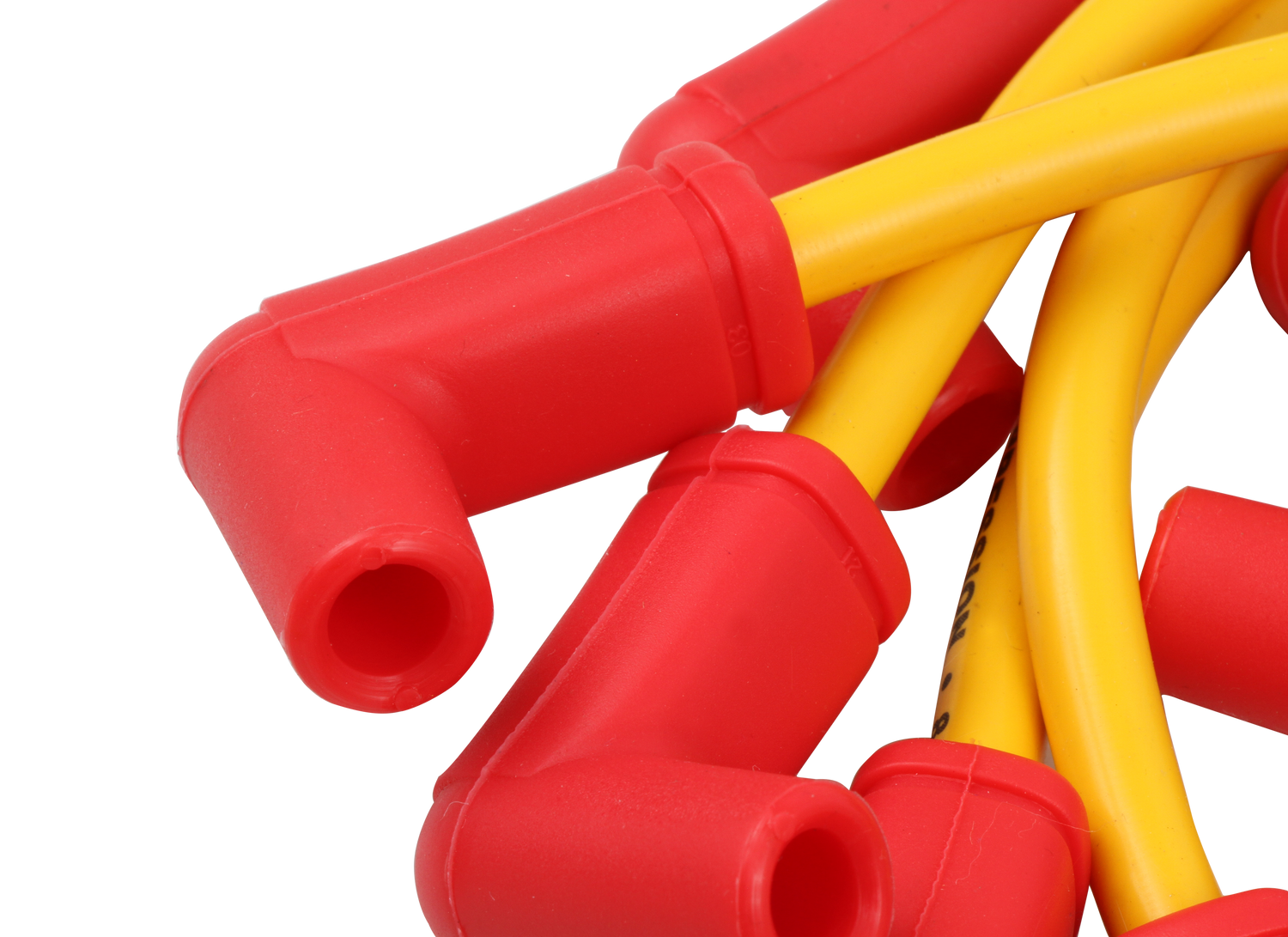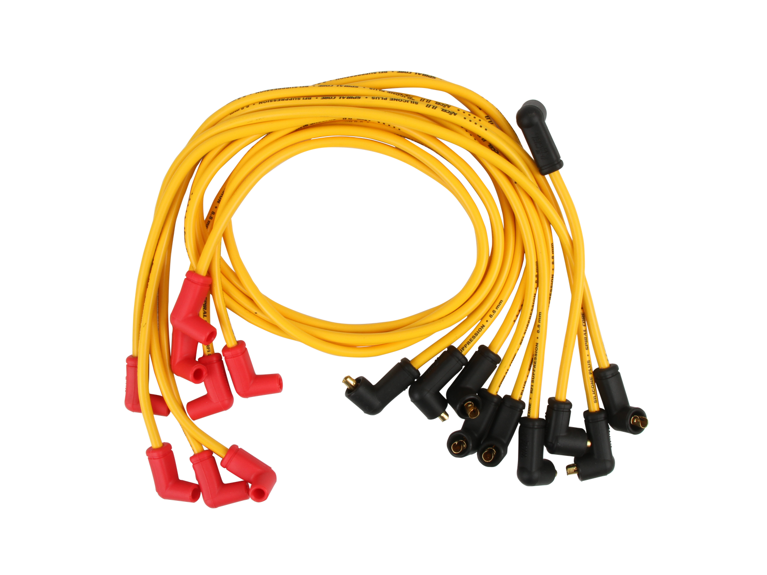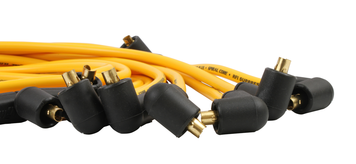 Custom Fit Spark Plug Wire Set; Spiral Core; Heavy Duty 8.8mm Oversized Silicone Jacket; 150 Ohms Per Foot Of Resistance; Wires Routed Under Exhaust Manifold; Yellow; Set;