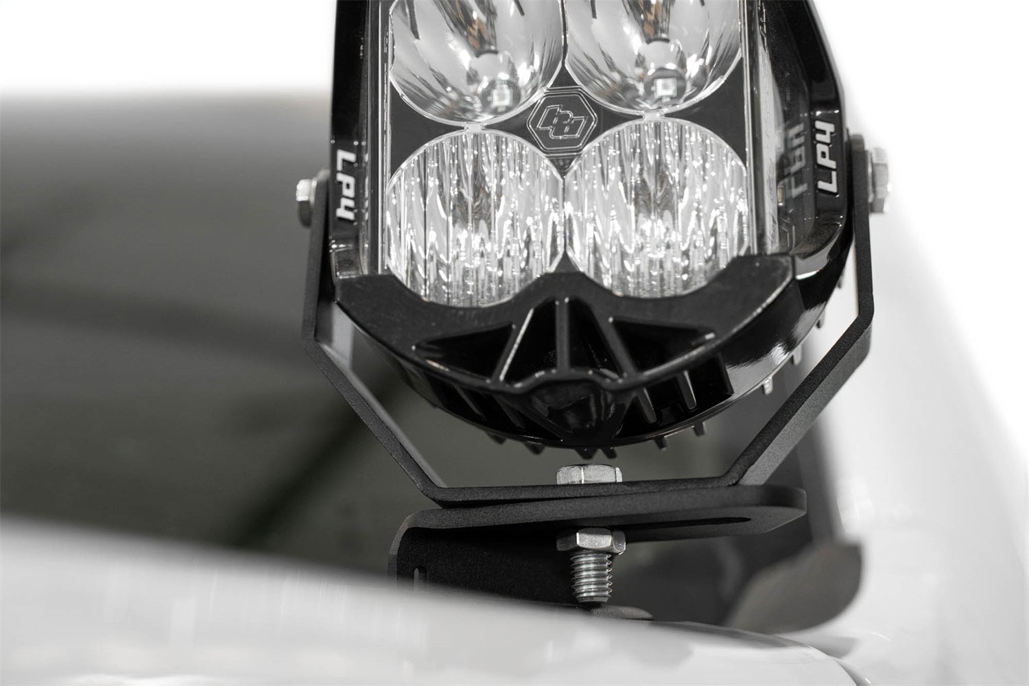 Our Ditch Light Brackets were designed for versatile forward or side angled lighting. The light brackets mount to the hood hinges and are positioned out of your sight lines at the base of the a-pillar. Lighting options include anything from a 3 in. Rigid or Baja cube light to a Rigid 360 or Baja Designs LP6 round light. They feature low-profile fitment that compliments the OEM body lines. Integrated wire management keeps the install looking clean. As always, these are fully bolt-on and Made in America.