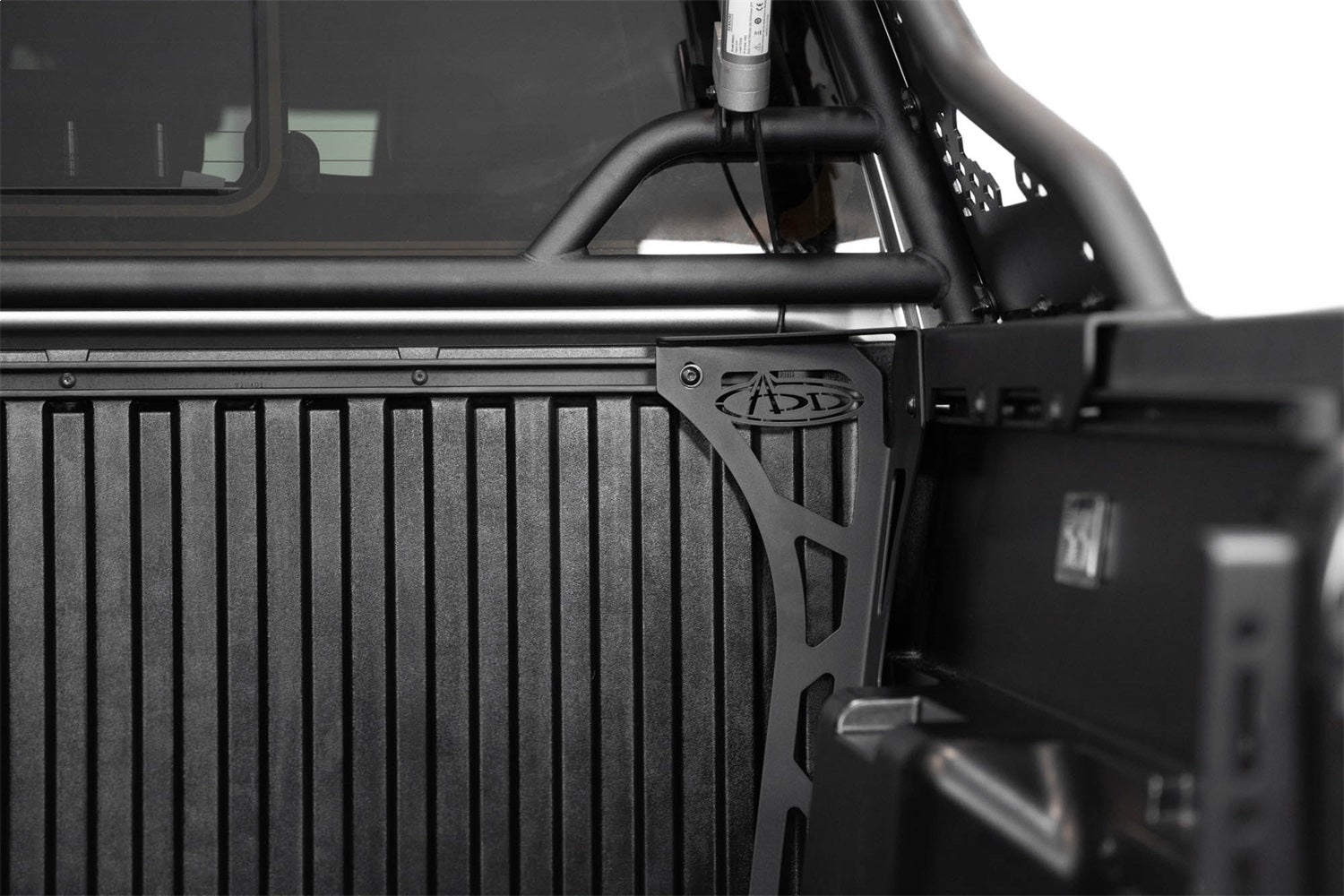Our Race Series 2024 Tacoma Chase Rack is designed to elevate your truck's styling while providing you with supplemental lighting and gear mounting capabilities. The rack's precise fitment follows the contours of your Tacoma, complimenting its sleek factory design. For forward or rear facing lighting options, our rack features an integrated actuated light bar mount that can face lights towards either direction for different lighting preferences. You can raise or lower the light mount from the comfort of your cab when needing to adjust your truck's clearance for garages or tight spaces. The mount can fit up to one 40-inch light bar or five round lights, along with other combinations. The durable design of the chase rack and the included bed cab corner braces add additional rigidity and further strengthen your truck bed when adventuring off-road. Made from American steel, this rack will withstand the toughest terrain. The resilient dual-stage hammer black powder coat finish with satin black lightweight aluminum side panels provide utility and an aggressive style to your Tacoma. As always, ADD's chase rack is proudly made in the USA.