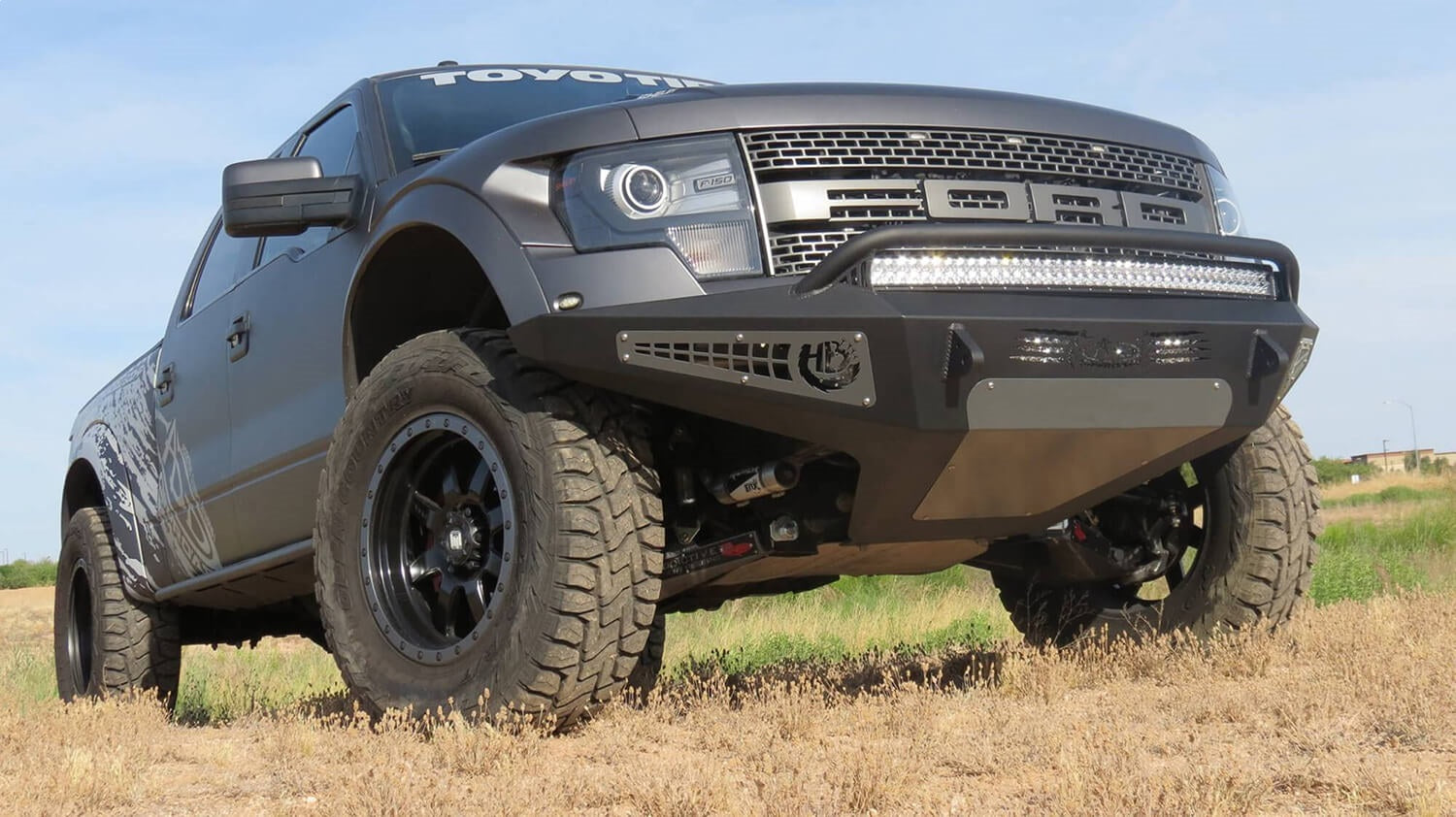2010 - 2014 Ford Raptor HoneyBadger Front Bumper with 40" LED bar mounts and 20" LED bar mount in lower with HB logo cutout with 10" LED bar mounts and Dually mounts in sides panels in Hammer Black with Satin Black panels