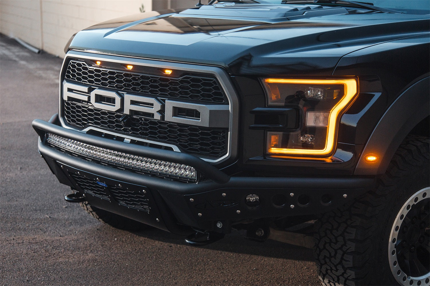 2017 - Up Ford Raptor Stealth R Front Bumper with stealth panels and universal light bar mount with vents for intercooler and duallys in Hammer Black with Satin Black panels