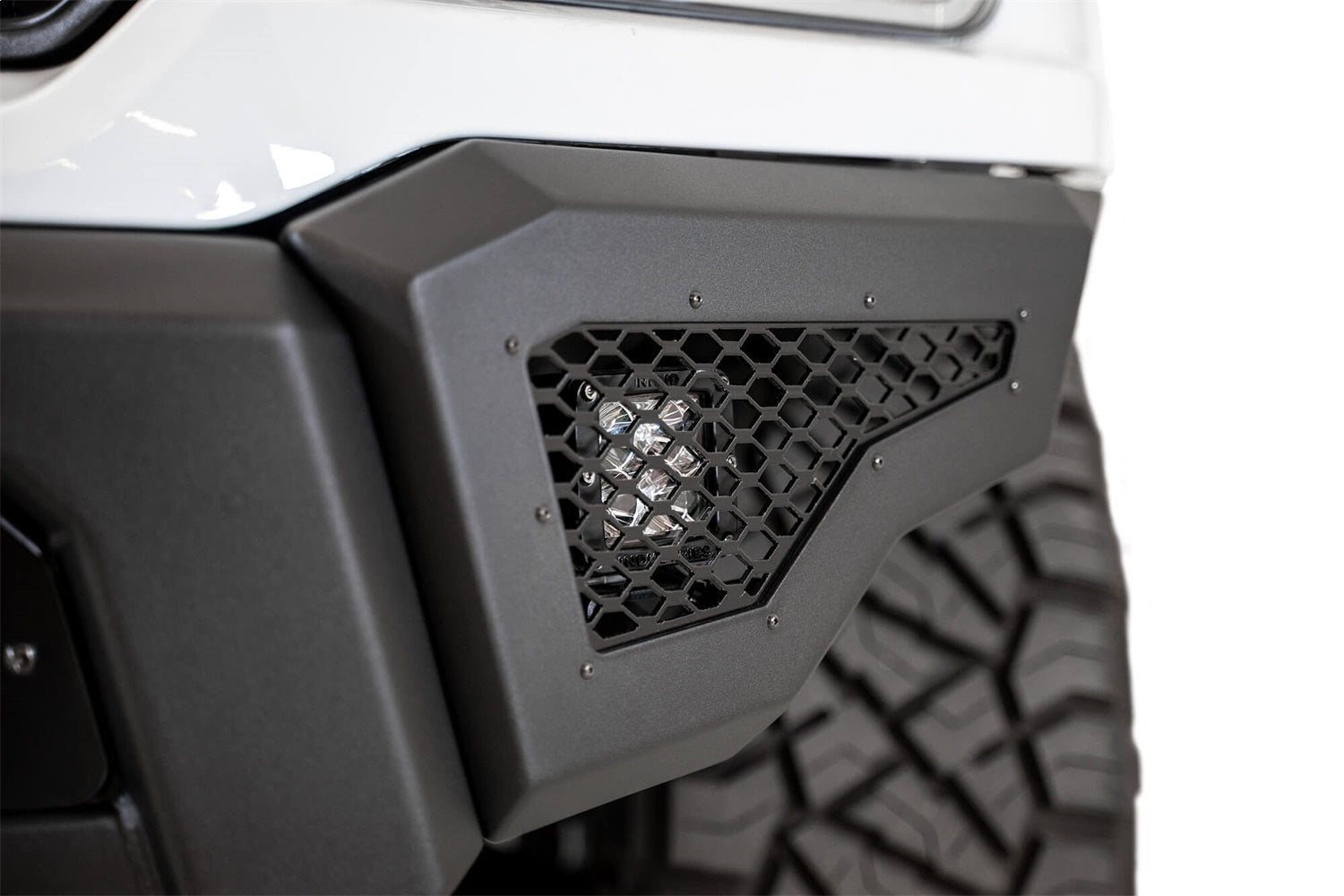 The Stealth Front Bumper from Addictive Desert Designs truly transforms the front of your Ford F-150. The modern plate steel design aligns perfectly with OEM body lines to make it look like it belongs on the truck from the factory. The high clearance design gives more approach angle and an aggressive look. The center of the bumper holds a 20" straight light bar, while each side panel can fit a single cube light. The Stealth bumper is compatible with the OEM Ecoboost intercooler while also retaining the factory tow hooks. As always, this product is made in America.