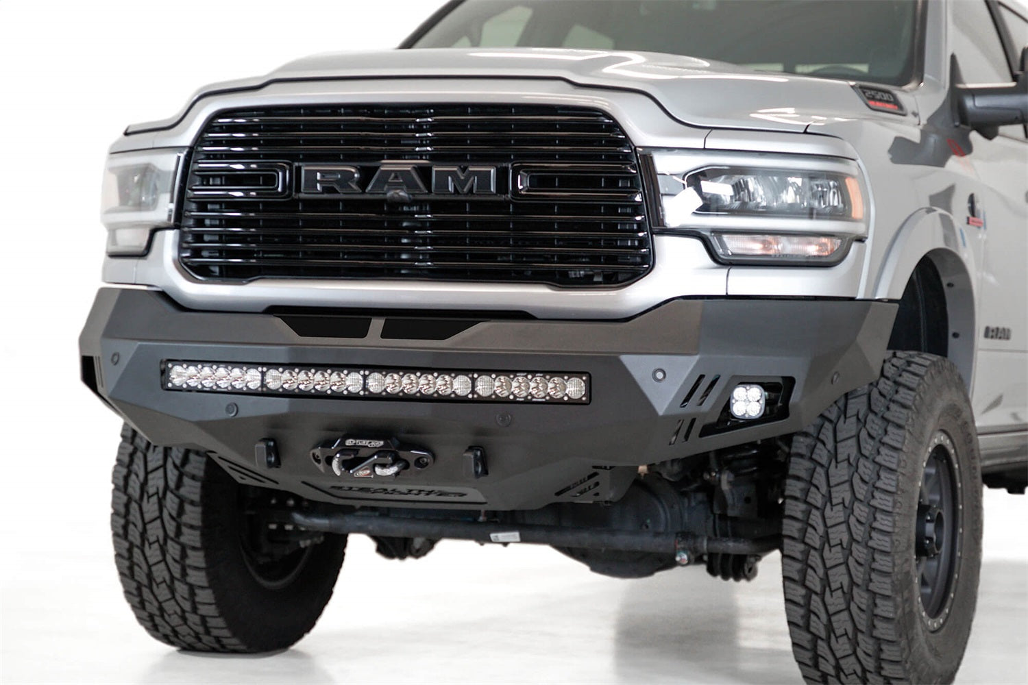 Addictive Desert Designs is proud to bring the Stealth Fighter line of bumpers to the 2020 Ram 2500/3500 platform. A radius plate steel design allows the bumper to stay tight to the front of the truck. Our universal light mount system in the center of the bumper allows the use of a 40 in. radius light bar or up to 10 cube lights. There is an additional cube light mount behind each side panel. Standard cutouts allow this bumper to retain OEM parking sensors. The Stealth Fighter comes standard with a Winch mount that bolts directly to the vehicle's frame for greater strength. Access holes in the top of the bumper ensure maximum Winch functionality. Our clevis mounts also provide a reinforced mounting point for 3/4 in. D-rings. As always this product is fully bolt-on and made in America.
