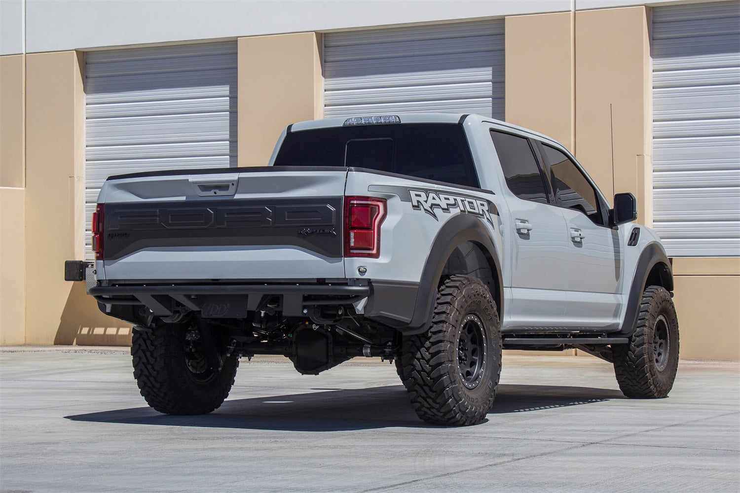 Ford Raptor ADD PRO rear bumper with backup sensor cutouts in Hammer Black powder coat with Satin Black powder coat panels