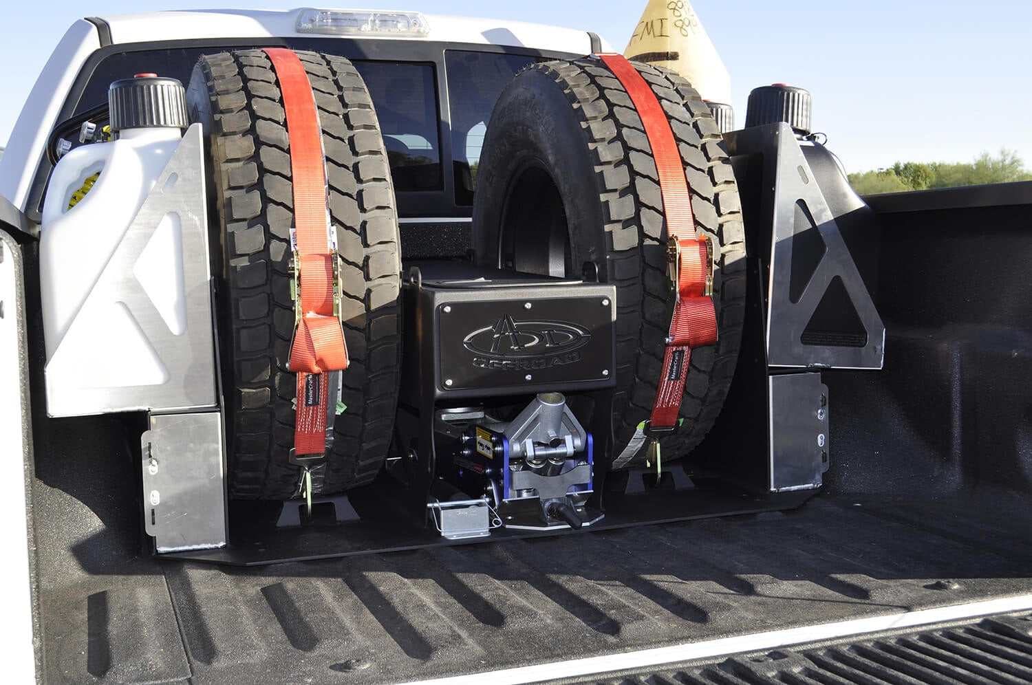 The New Bed Cage for the F-Series Trucks makes getting all of your gear out to the races or weekend on the trail easy, while looking incredible doing it! With multiple mounting options for Fuel Cans and Accessories, these can be tailor made to suit your needs, yet flexible enough to adapt for different adventures. The lockable Toolbox allows for safe storage for all of your trail tools and the optional pull out drawers fit quart just perfectly. Accessory mounts for 5 Gallon Square Fuel Tanks, Round Dump Cans, Powetank 10 lb. CO2 Inflator Tanks, and Race Jacks. Mix and match to get all of your required items out with you and safely held down in your bed. There are 6 mounting locations for Fuel Tanks, Dump Cans and CO2 Bottles. Only 2 Dump Cans mounts can be used per side due to their larger size, but a CO2 Bottle can be fit with 2 Dump Cans on a side. See the Configurations legend for ideas on how to build yours! Features: Hammer Black with Satin Black Powdercoating Spare Tire Carriers will fit up to a 37"; Spare Tire Carrier measures 13" Wide; Tire Laser Cut Panels, Tabs and Plates for a Precise Fit Direct fit ? No Cutting or Welding required Stainless Steel Hardware **Accessory mounts are Raw Aluminum and can be powdercoated Hammer Black match the Bed Cage. Optional Drawers only available in Raw Aluminum.
