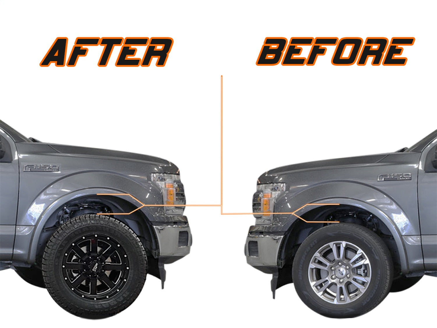aFe CONTROL Leveling Kits are made from 6061 billet aluminum and provide a 2.0-Inch lift in the front to provide better off-road performance while also eliminating the “nose-down rake” notorious on stock trucks. High quality hardware is used for strength and durability. Installation of these 2.0-inch leveling spacers can be done at home with the proper tools and safety precautions. Installing these spacers does not require disassembly of the strut/spring.