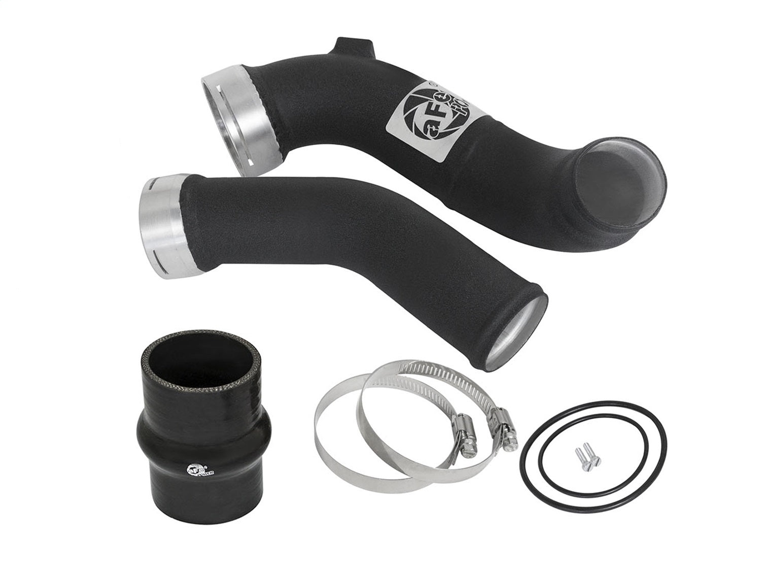 Perfect Fit: Includes stainless steel clamps for a leak-free seal and heavy-duty 5-Ply polyester reinforced silicone hump coupling for strength. Mandrel-bent Tubing: Constructed of 2-1/2" to 3" mandrel-bent aluminum tubing then powder-coated wrinkle-black for heat and corrosion resistance. The smooth transition mandre l bends decrease turbulence which increases horsepower and torque. The high-temp wrinkle-black powder-coating insulates the tubes from engine heat and protects them from corrosion. Two 1/8" NPT ports are provided for sensors or water-methanol injection. aFe Badging: Unique aluminum laser-cut aFe Power logo plate is welded-on for an aggressive style.