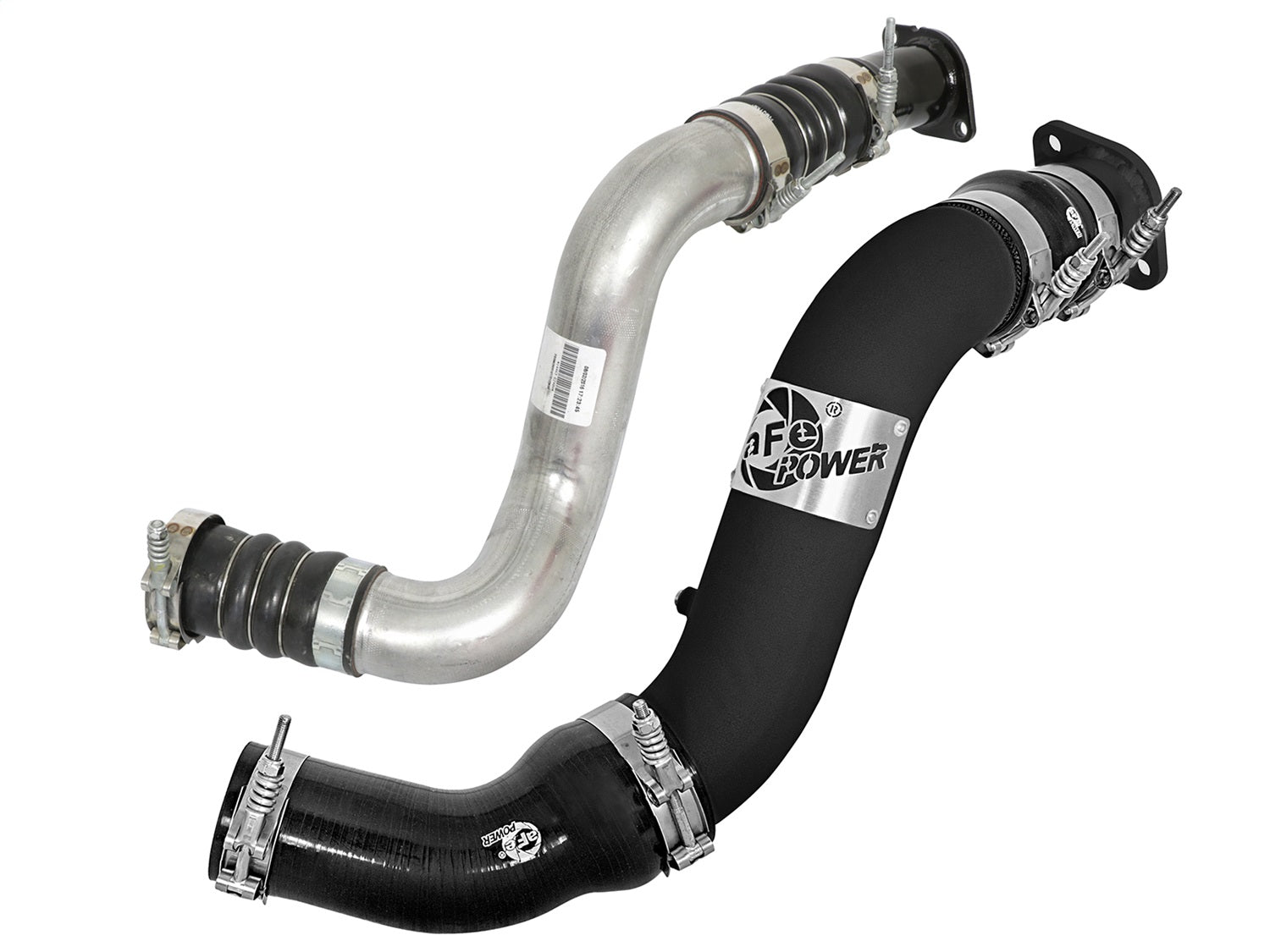 Flow and Performance: Constructed of mandrel-bent, powder-coated aluminum tubing for maximum flow. The smooth transition bends decrease turbulence and minimize pressure loss, increasing horsepower, torque and lowering EGT's. Perfect Fit: Utilizes the factory mounting locations to provide stability for a hassle-free installation. Includes high quality stainless steel spring loaded t-bolt clamps and heavy-duty 5-Ply couplings for strength. Fits OEM or aFe's upgraded intercooler (46-20281). aFe Badging: A unique laser-cut aFe power logo plate is welded-on for an aggressive style.