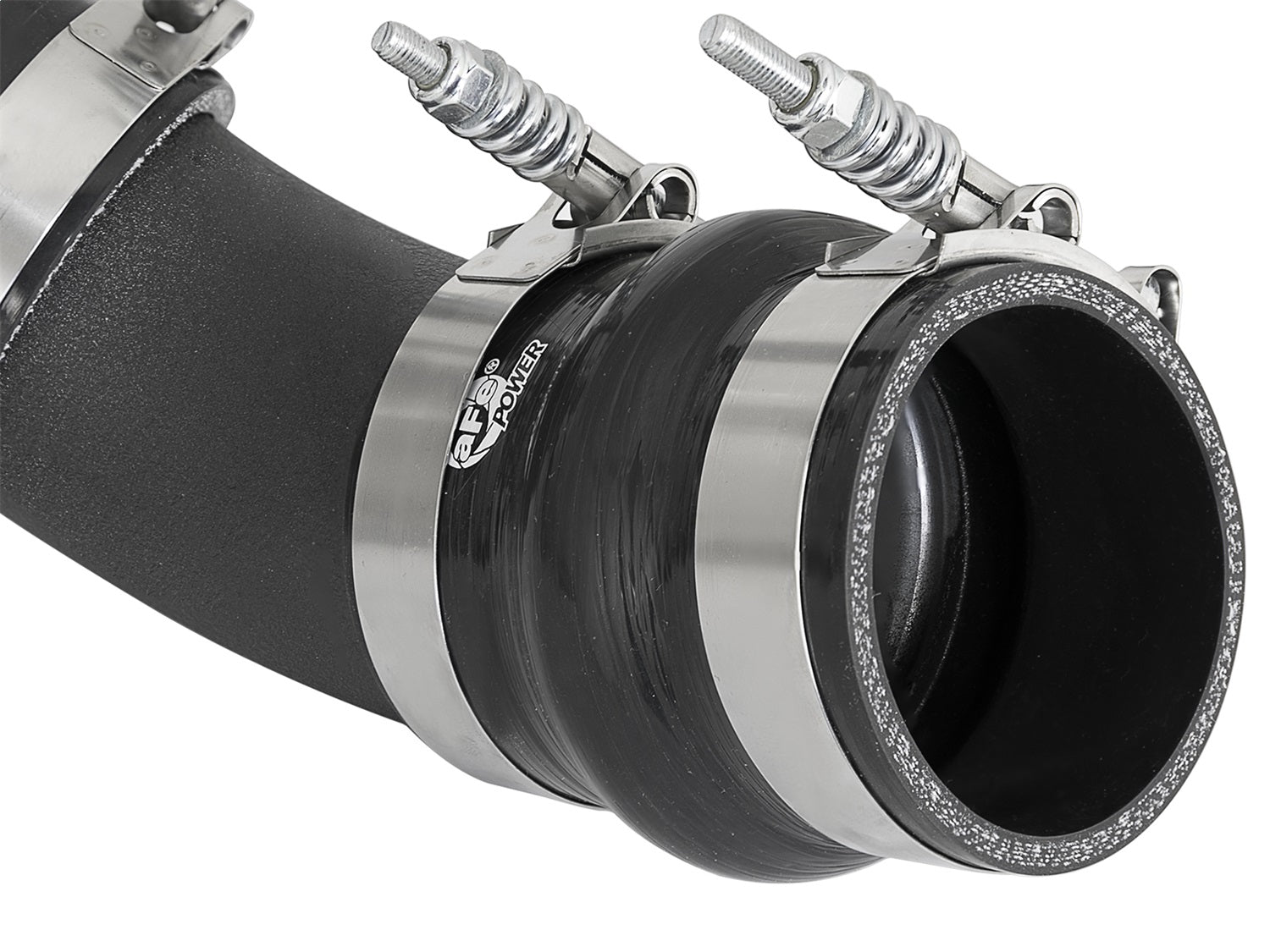 This BladeRunner intercooler tube kit delivers more flow and is more robust to handle higher horsepower and boost than the factory intercooler tubes on the 2017-2019 GM L5P diesel. TIG-welded and designed from aircraft-grade, mandrel bent aluminum tubing, the BladeRunner I/C tube kit features factory mounting locations, quality hardware and 5-ply silicone couplings for a secure, hassle free installation. Flow and Performance: Constructed from 3" and 3 1/2" aluminum tubing, both I/C tubes are mandrel bent and powder coated for maximum flow and performance. Smooth transition bends decrease turbulence and minimize pressure loss, increasing horsepower, torque and lowering EGT's. The BladeRunner I/C tube kit transfers hot air smoothly to the intercooler to accelerate heat transfer then cooled air to the engine to help make more power. Perfect Fit: Factory mounting locations, quality stainless steel spring-loaded T-Bolt clamps and heavy-duty 5-ply polyester reinforced silicone couplings ensure a secure install. The cold side tube includes a factory-style quick connect with an O-ring seal for a quick and simple install. 1/8" NPT ports are provided on each tube for connecting auxiliary sensors and retains the factory air temp sensor for a hassle-free installation. Custom Appearance: Finished in wrinkle-black powder coating and badged with a unique aluminum laser-cut aFe Power logo welded on for a custom look.