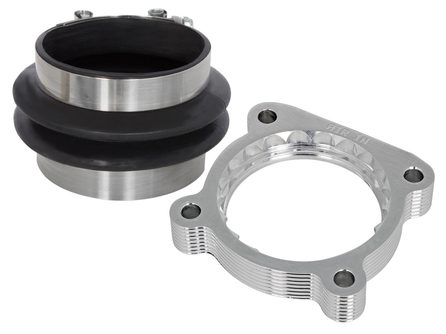 The Serrated/Helix design creates air turbulence in the intake manifold to increase air pressure in the combustion chamber resulting in increased horsepower, torque and improved throttle response. The Serrated/Helix combination design also reduces intake whistle that occurs with other helix only designs. (US PAT 07055513). Made from 6061-T6 Billet Aluminum aFe Silver Bullet Throttle Body Spacers are precision machined for lightweight, high strength and perfect fit. These spacers come with gaskets and use all factory mounting locations for a hassle-free installation.