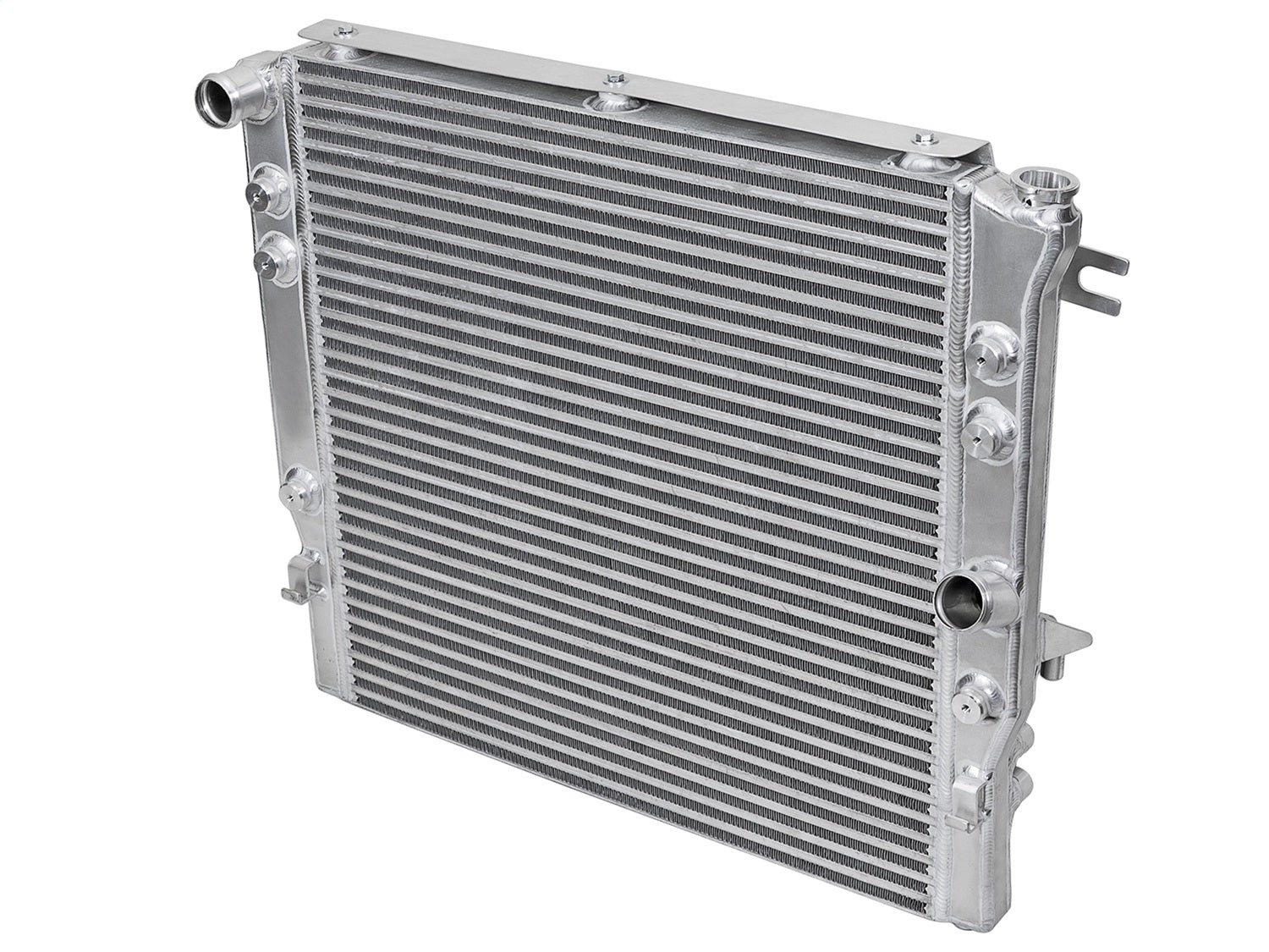 This BladeRunner GT Series Radiator keeps your 2007-11 Jeep Wrangler JK with the 3.8L running cooler, longer. 100% aircraft-grade 5052 aluminum, 1-3/4" bar and plate core design and 1/8" aluminum fabricated end tanks handle rock-crawling and street hauling. Includes upper and lower 5-ply polyester reinforced silicone hoses and quality stainless steel, T-Bolt clamps for a simple, secure installation. Unique 1-3/4" Bar and Plate Core Design: 25% more efficient than factory tube and fin core design. The BladeRunner features a bar and plate core design which provides greater heat dissipation and better coolant flow for optimum cooling efficiency. Flow and Performance: Aircraft-grade aluminum construction and larger core offers 25% more coolant capacity to maintain cooler temperatures. Includes both upper and lower 5-ply polyester reinforced silicone hoses that withstand high-temperatures and outlast factory rubber hoses. End Tanks: The unique BladeRunner end tanks are constructed out of 1/8'' TIG-welded aluminum plates for strength and durability. Billet Aluminum Inlet/Outlet: 1 1/2" diameter billet aluminum inlet and outlet for long-lasting reliability. TIG-Welded: 100% TIG-welded by certified craftsmen for race proven strength and durability. TIG-welding provides the strongest welds reducing stress cracks. Brass Drainage Valve: This radiator includes a 1/4" NPT brass drain valve with a barbed fitting to connect a hose for draining coolant easy and mess free. Perfect Fit: Utilizes the factory mounting locations to provide stability for a hassle-free installation. Includes high quality, stainless steel, T-Bolt clamps and heavy-duty 5-ply silicone hoses for strength. Custom Appearance: Brushed aluminum finish with an aFe Power logo painted on the front. Radiator hoses are finished in black silicone with an aFe Power logo printed on them.