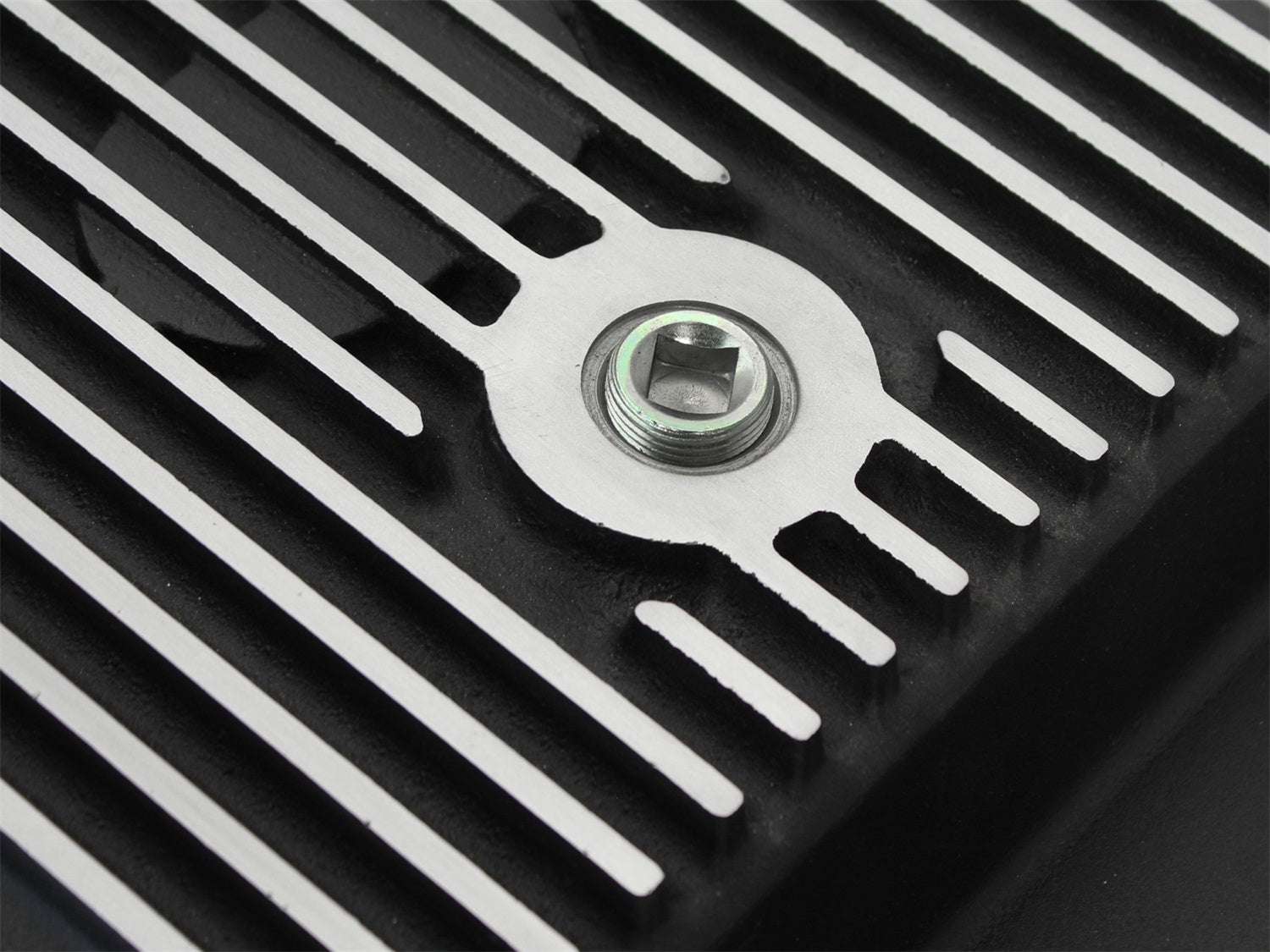 aFe POWER Pro Series deep transmission pan brings performance engineering to the protection of your trucks transmission. This transmission pan has additional capacity for 3 more quarts over stock at the factory line, a magnetic drain plug and a 1/8" NPT port for your temperature sensor. Built-in internal and external fins transfer heat from the fluid to the outside air for maximum cooling. This transmission pan is constructed out of durable die-cast A380 aluminum with reinforced ribs and a wrinkle black powder-coating for maximum strength and styling.