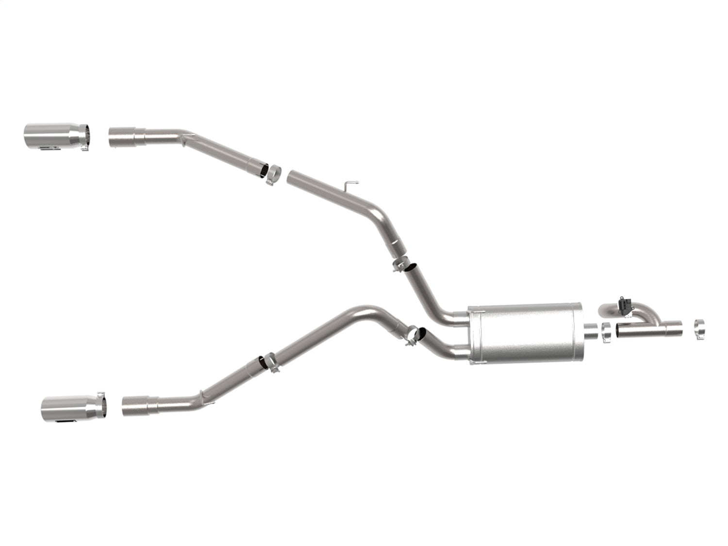 This cat-back exhaust system is constructed of 3 IN mandrel-bent 304 stainless steel tubing for maximum strength and durability. This system features a high-flow stainless steel muffler, producing a aggressive sound. Muffler finish may vary. Finishing off this exhaust system are dual 5 IN diameter polished stainless steel clamp-on exhaust tips. The tips features an aFe POWER logo plate riveted on for a unique style. This system produces an aggressive sound unleashing all available horsepower and torque. Utilizing factory style hangers this system is a direct bolt-on system, which requires no cutting or modifications for a hassle-free installation. This kit includes key fob remotes, control module, valve motor, and all necessary wiring. It's a simple installation, requiring no cutting of any wires or interference of the automobile's electronics. This system features an electronically controlled exhaust cutout valve to quickly switch between exhaust tones at the push of a button. Utilizing state-of-the-art computer-aided design technology, this exhaust system is designed for custom, high tolerance factory fitment. 100% MIG-Welded for race-proven strength and durability.