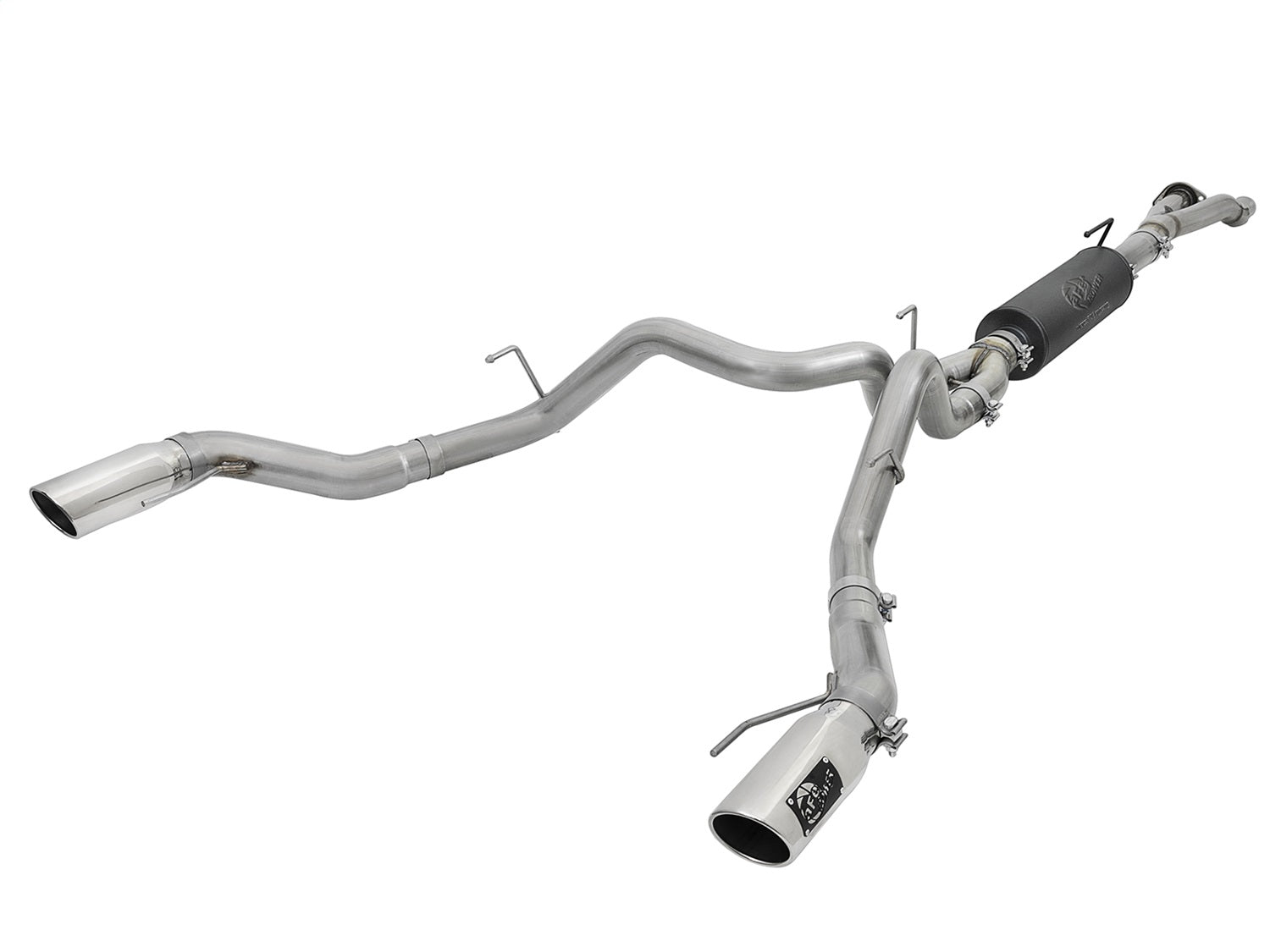 Undoubtedly, your Ford Raptor with the V6-3.5L (tt) EcoBoost is fully capable of handling anything you can throw at it. Now you can maximize your Raptor's full power, sound and style potential with aFe's MACH Force-Xp cat-back exhaust system. Constructed of 3" and 3 1/2" mandrel-bent, 304 stainless steel tubing, the MACH Force-Xp is 100% hand MIG-welded by certified craftsmen for race proven strength and durability for the long haul and uses factory style flanges and hanger locations for a secure, leak-free seal and hassle-free Install. aFe's 7" round x 24" long, free-flowing muffler is high-temp powder-coated metallic-black to improve performance across the Raptor's power band while delivering a powerful, aggressive tone. This dual rear-exit system is finished off with 4-1/2" polished, angle-cut, rolled stainless steel exhaust tips with laser-cut aFe POWER badge for a custom-styled look. Dual Y-Merge Assemblies: Evenly distributes exhaust pulse s to minimize interior drone and enhance external tone. Aggressive Sound: Free-flowing, stainless steel, black powder-coated 24" length round muffler to absorb high pitch tones producing a powerful sound and unleashing more horsepower and torque potential. Dual 4-1/2" stainless steel exhaust tips: This dual rear-exit system features 4-1/2" dia. polished, angle-cut rolled 304 stainless steel exhaust tips w/ laser-cut aFe POWER badge for a custom-styled look. Installation is a snap: This MACH Force-Xp exhaust system uses all factory mounting locations providing stability and a hassle-free installation. Perfect Fit: OE-style bayonet hangers are used to maintain a stable pipe location during any driving conditions. The bayonet tip holds the hanger bushing in place for an OE style, long lasting fit. Leak-Free Seal: High quality band clamps are used for a complete 360-degree sealing surface.