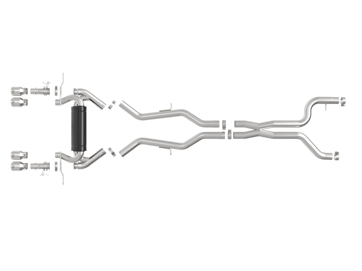 This cat-back exhaust system is constructed of 3 IN - 2-1/2 IN mandrel-bent brushed finished 304 stainless steel tubing for maximum strength and durability. This system features a high-flow stainless steel high-temperature metallic black muffler, producing a powerful sound. The muffler has a high-temperature metallic black finish for ultimate corrosion resistance. Finishing off this exhaust system are quad 4 IN diameter polished stainless steel clamp-on exhaust tips. The tips features a laser etched aFe POWER logo for a unique style. This system produces a powerful sound unleashing all available horsepower and torque. Some cutting may be required, see instruction sheet for further information. Utilizing factory style hangers this system mounts directly to factory mounting locations for a hassle-free installation. A mitered merge x-pipe is used to balance and evenly distribute exhaust pulses traveling through the exhaust system, minimizing exhaust drone and maximizing scavenging. This system incorporates factory style exhaust valves which use the factory exhaust valve motors (not included). The valves help regulate, direct and control the flow of exhaust gases by opening, closing, or partially obstructing passageways depending on throttle position for maximum performance. State-of-the-art computer-aided design technology is utilized for precise vehicle fitment. 100% TIG-Welded for race-proven strength and durability.