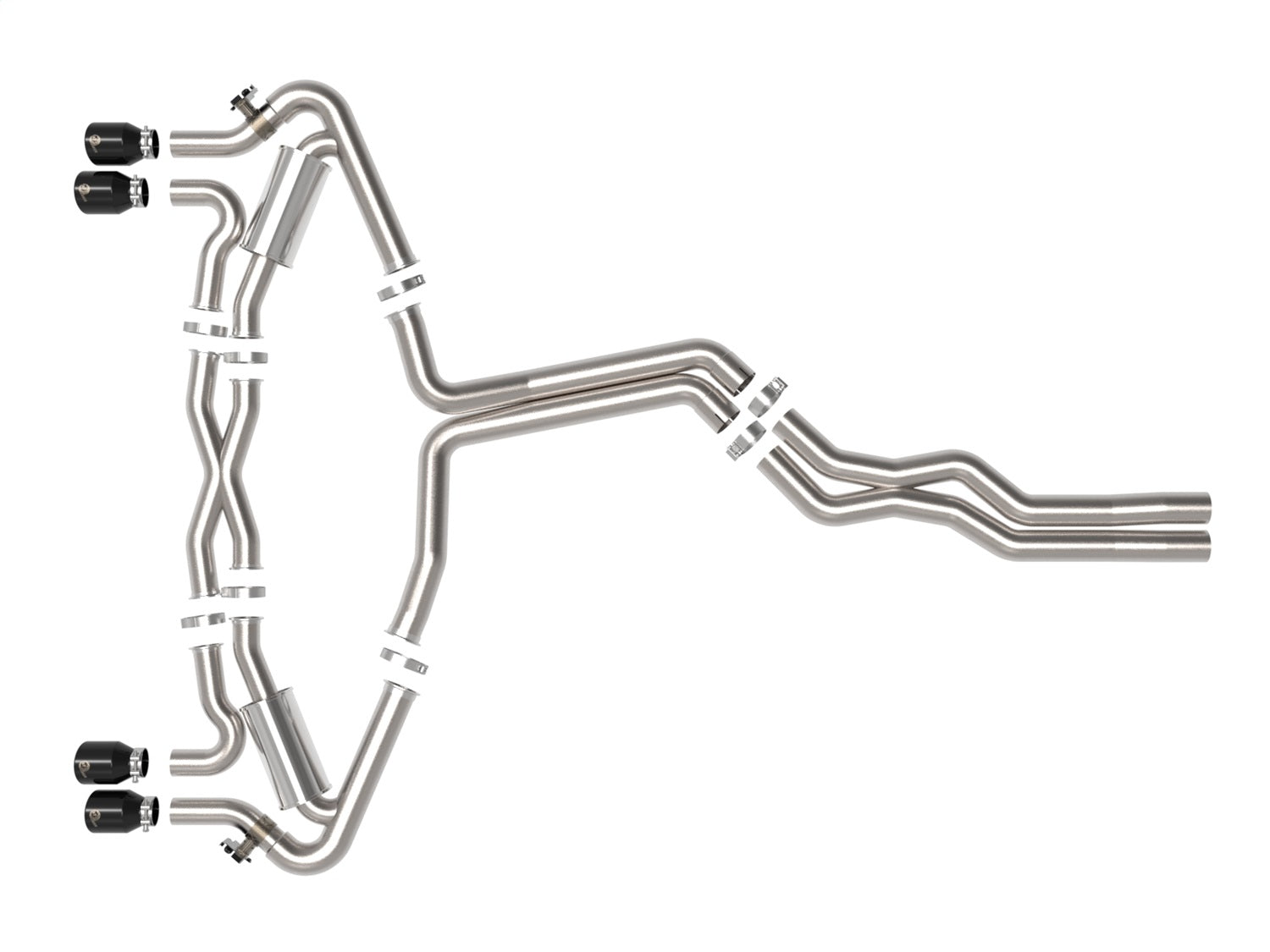 This cat-back exhaust system is constructed of 3 IN - 2-1/2 IN mandrel-bent brushed finished 304 stainless steel tubing for maximum strength and durability. This system features high-flow 304 stainless steel mufflers, producing a deep sound. Finishing off this exhaust system are quad 3-1/2 IN diameter black 304 stainless steel clamp-on exhaust tips. The tips features a laser etched aFe POWER logo for a unique style. This system produces a deep sound unleashing all available horsepower and torque. Utilizing a factory style flange and hangers this system is a direct bolt-on system, which requires no cutting or modifications for a hassle-free installation. This cat-back exhaust system uses a heavy duty flex pipe with an internal interlock liner for added strength and durability. A mitered merge x-pipe is used to balance and evenly distribute exhaust pulses traveling through the exhaust system, minimizing exhaust drone and maximizing scavenging. This system incorporates factory style exhaust valves which use the factory exhaust valve motors (not included). The valves help regulate, direct and control the flow of exhaust gases by opening, closing, or partially obstructing passageways depending on throttle position for maximum performance. State-of-the-art computer-aided design technology is utilized for precise vehicle fitment. 100% TIG-Welded for race-proven strength and durability.