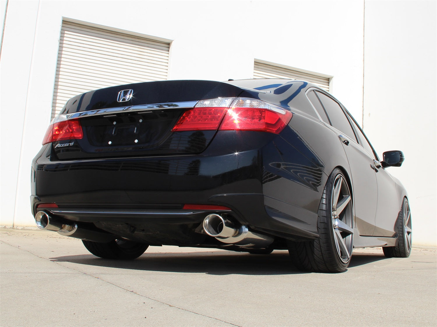 aFe is proud to introduce the new Takeda Dual Cat-Back Exhaust System for the 13-14 Honda Accord LX, EX, EX-L Sedan L4-2.4L. In recent testing this system produced 13 horsepower and 16 lbs. x ft. of torque. This exhaust starts out with an OE style flange and uses 2.5in. mandrel bent 304 stainless steel tubing and merges into dual 2.5in. tubing which improves performance across the power band while maintains a great tone. The dual, high flow, polished 304 stainless steel mufflers give an aggressive sound at high RPMs, yet maintaining a subtle tone at cruising speeds. To finish off this 100% TIG-welded exhaust are dual, Takeda laser etched, double wall, angle cut 304 stainless steel tips. This exhaust is designed to convert the standard L4 single exhaust into a sporty dual exhaust. It is a direct bolt on system which requires no cutting or drilling and includes all necessary hardware for a hassle free installation.