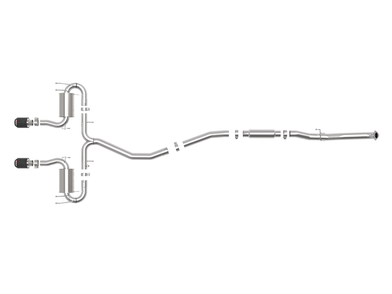 Performance Gains: This system produced gains of up to +6 HP and +5 lbs. x Ft. TQ., as measured on our in-house dyno. 3" - 2-1/2" 304 Stainless Steel Construction: This cat-back exhaust system is constructed of 3" - 2-1/2" mandrel-bent, brushed finished 304 stainless steel tubing for maximum strength and durability. High-Flow 304 Stainless Steel Polished Mufflers: This system features high-flow 304 stainless steel polished mufflers, producing a smooth sound. The mufflers has a polished finish for ultimate corrosion resistance. Dual 4-1/2" Diameter Carbon Fiber Exhaust Tips: Finishing off this exhaust system are dual 4-1/2" diameter carbon fiber 304 stainless steel clamp-on exhaust tips. The tips features an aFe POWER logo for a unique style. Installation: Utilizing a factory style flange and hangers this system is a direct bolt-on system, which requires no cutting or modifications for a hassle-free installation. Integrated Mitered Merge Collector: A mitered merge collector is used to decrease turbulence and increase exhaust velocity resulting in increased horsepower, torque and improved throttle response. Computer-Aided Design: Utilizing state-of-the-art computer-aided design technology, this exhaust system is designed for custom, high tolerance factory fitment. TIG-Welded: 100% TIG-Welded for race-proven strength and durability. Emissions Disclaimer: This product does not require a CARB EO#. aFe POWER exhaust systems are engineered and manufactured in our Corona, California facility.