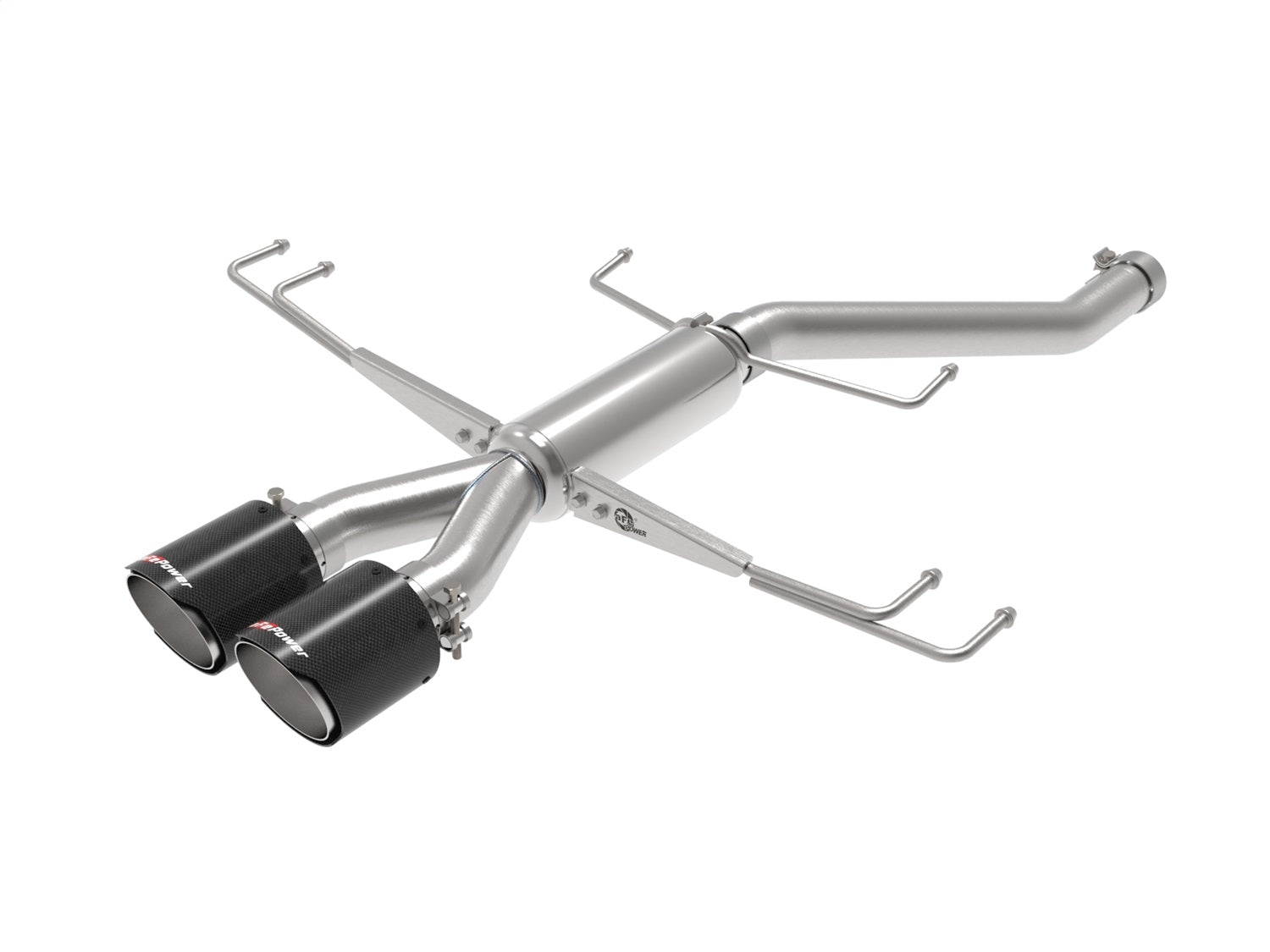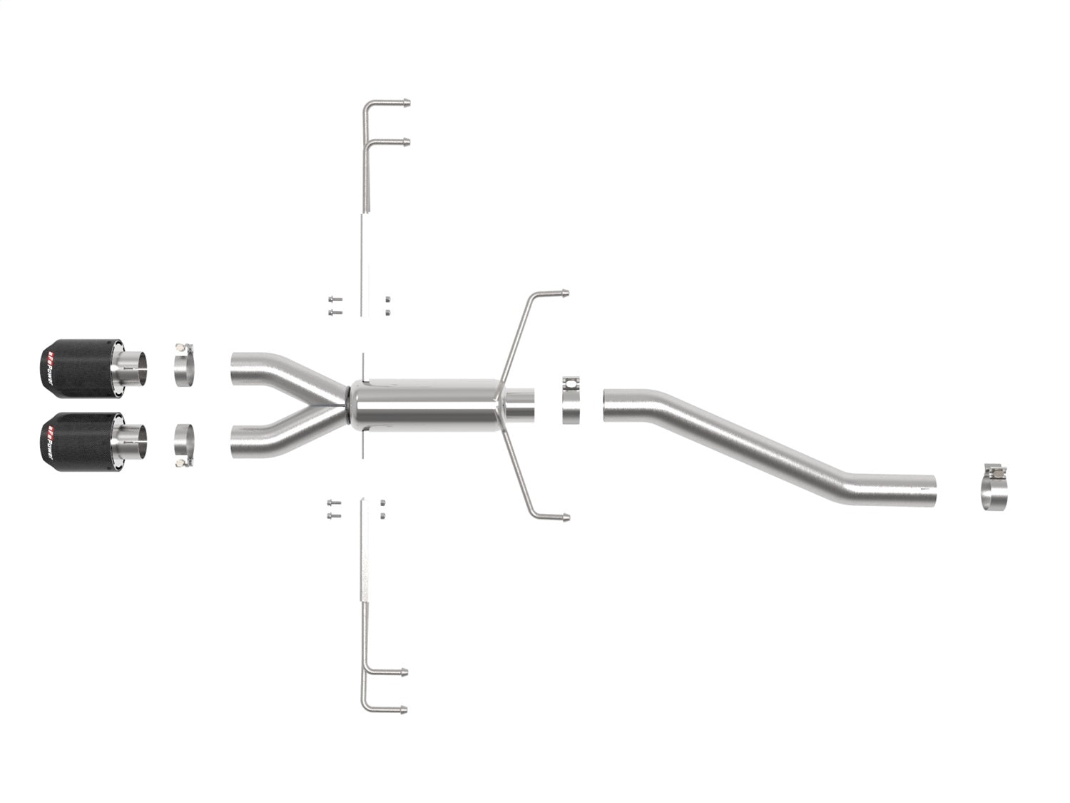 2-1/2" 304 Stainless Steel Construction: This axle-back exhaust system is constructed of 2-1/2" mandrel-bent 304 stainless steel tubing for maximum strength and durability. Dual 4-1/2" Diameter Carbon Fiber Exhaust Tips: Finishing off this exhaust system are dual 4-1/2" diameter carbon fiber 304 stainless steel clamp-on exhaust tips. The Tip features an aFe POWER logo for a unique style. Installation: Requires cutting factory exhaust. Utilizing factory style hangers this system mounts directly to factory mounting locations for a hassle-free installation. Integrated Mitered Merge Collector: A mitered merge collector is used to decrease turbulence and increase exhaust velocity resulting in increased horsepower, torque and improved throttle response. Computer-Aided Design: Utilizing state-of-the-art computer-aided design technology, this exhaust system is designed for custom, high tolerance factory fitment. MIG-Welded: 100% MIG-Welded for race-proven strength and durability. Note: Some cutting is required, see instruction sheet for further information. Emissions Disclaimer: This product does not require a CARB EO#. aFe POWER exhaust systems are engineered and manufactured in our Corona, California facility.