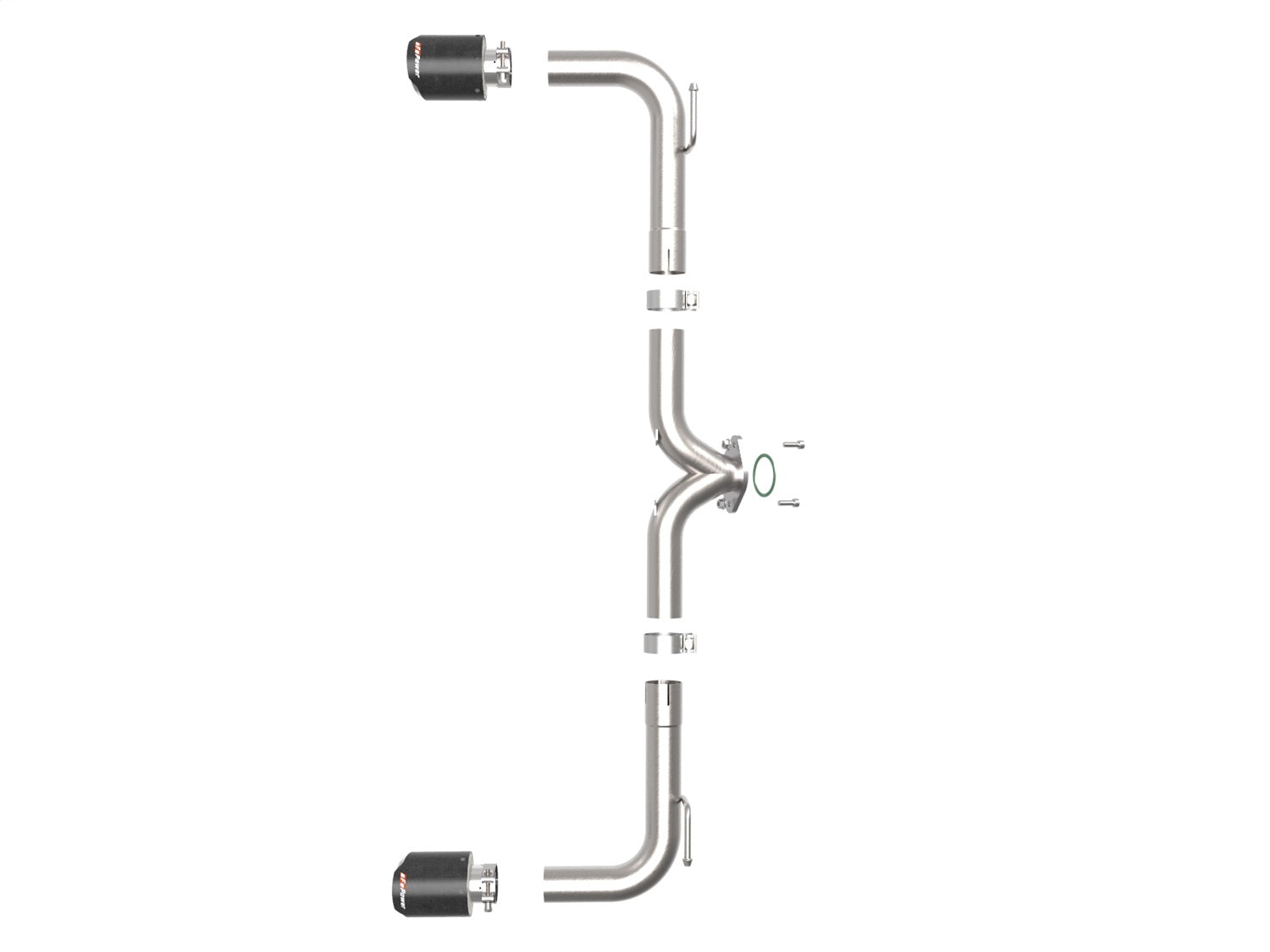 This system produced gains of up to +6.45 HP and +8.12 lbs. x Ft. TQ., as measured on our in-house dyno. This axle-back exhaust system is constructed of 2-1/2" mandrel-bent 304 stainless steel tubing for maximum strength and durability. Finishing off this exhaust system are dual 4-1/2" diameter carbon fiber 304 stainless steel clamp-on exhaust tips. The tips features a laser etched aFe POWER logo for a unique style. This system produces a deep sound unleashing all available horsepower and torque. Utilizing a factory style flange and hangers this system is a direct bolt-on system, which requires no cutting or modifications for a hassle-free installation. A mitered merge collector is used to decrease turbulence and increase exhaust velocity resulting in increased horsepower, torque and improved throttle response. Utilizing state-of-the-art computer-aided design technology, this exhaust system is designed for custom, high tolerance factory fitment. 100% MIG-Welded for race-proven strength and durability.