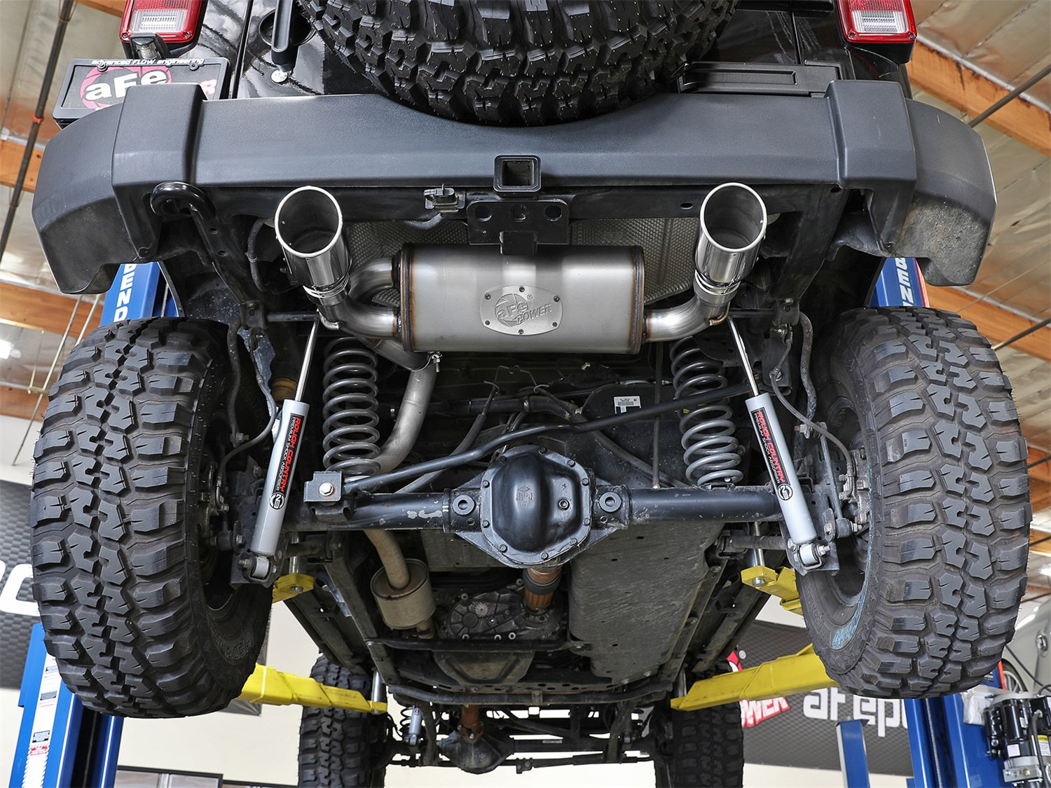 aFe's Rebel Series, dual black tip axle-back exhaust system for your 2007 - 2018 Jeep Wrangler (JK) with the V6-3.8L / 3.6L engine. This Rebel Series system is constructed with 2-1/2" mandrel bent 409 stainless steel tubing for improved exhaust flow. Utilizing factory mounting locations, the bayonet tip hangers ensure the Rebel Series exhaust has an OE-style fit and stays put under any driving conditions. A certified craftsman hand MIG welds the system for durability and longevity. High quality band clamps and hardware to provide a quick, hassle-free installation with no modifications necessary. Dual 4-1/2" angle-cut, high temp polished stainless steel exhaust tips with laser-cut aFe POWER badges to finish off the Rebel Series exhaust sys tem for the perfect combination of performance, value and style. Aggressive Sound: A free-flowing, stainless steel, 18" length muffler is used to absorb high pitch tones producing a powerful sound and unleashing more horsepower and torque potential. Dual 4-1/2" polished Exhaust Tips: This dual rear-exit system features 4-1/2" dia. high temp polished, angle-cut, rolled, stainless steel exhaust tips w/ laser-cut aFe POWER badge for a custom-styled look. Installation is a snap: This Rebel Series exhaust system uses all factory mounting locations providing stability and a hassle-free installation. Perfect Fit: OE-style bayonet hangers are used to maintain a stable pipe location during any driving conditions. The bayonet tip holds the hanger bushing in place for an OE style, long lasting fit. Leak-Free Seal: High quality band clamps are used for a complete 360-degree sealing surface.
