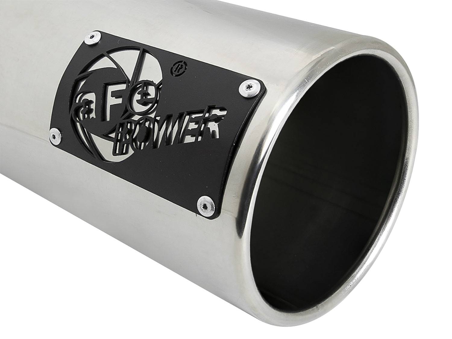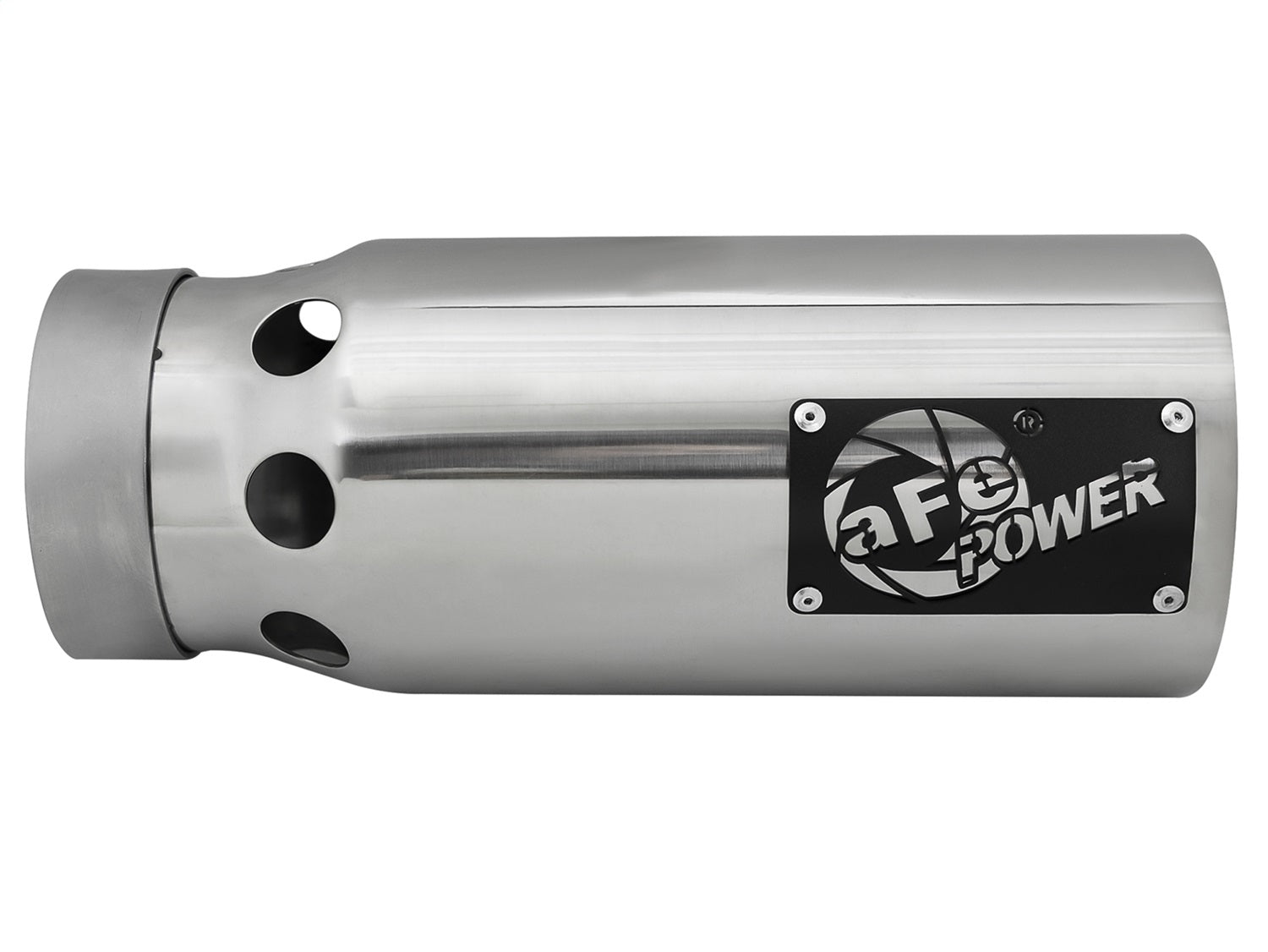 aFe Power is proud to introduce an all new intercooled exhaust tip. This tip comes with a high luster polished finish and is designed to fit 4" exhaust systems. With a 4" inlet x 5" outlet and 12" inch length, this single-walled, angle cut rolled tip comes with intercooling vents and a unique laser-cut aFe Power logo plate riveted on for an aggressive style.