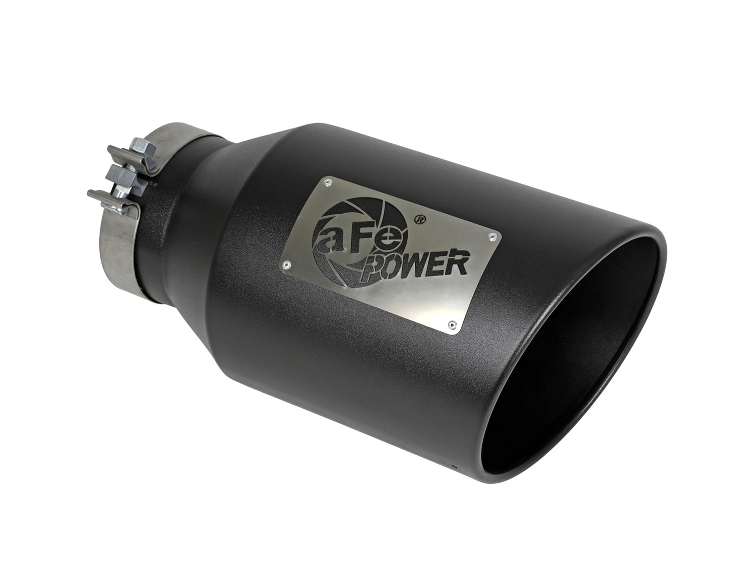 This direct-fit clamp-on tip is constructed from 304 stainless steel and features a black finish for corrosion resistance for long lasting good looks. Designed to fit 5" exhaust systems; 5" inlet x 8" outlet and 15" inch length. This tip features an aFe POWER logo for an aggressive, custom look. A high quality stainless steel clamp is used for a complete 360 degree sealing surface. This product does not require a CARB EO#.