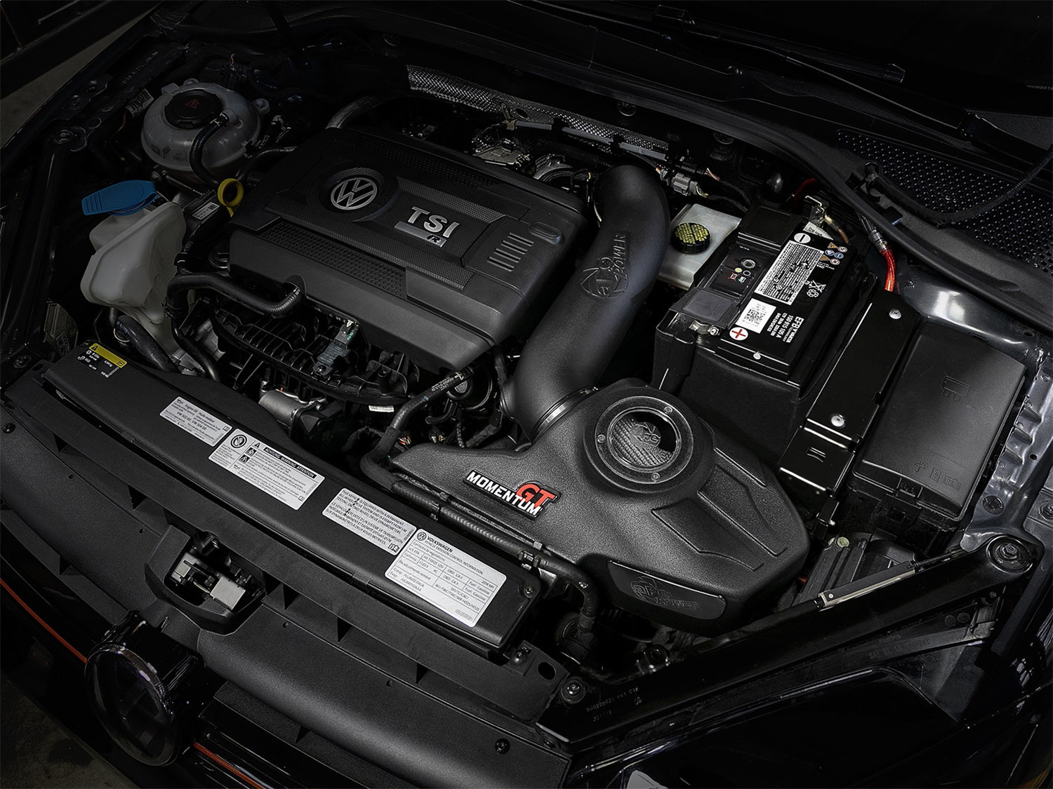 Large Three Layer Performance Air Filter:Momentum’s unique filter-to-housing interface was built to feature the largest air filter possible. This 7-1/2” tall 360-degree radial flow air filter features a 3-1/2" flange and our oil-free Pro DRY S media with three layers of synthetic media for maximum convenience. Its progressive layering provides great filtration efficiency and dust holding capacity, while not requiring the use of oils. This media is best suited for street use. Its inverted top makes for more filter surface area, resulting in longer service intervals.Unique One-Piece Housing:The smooth one-piece sealed housing, constructed of heat-resistant cross-linked polyethylene (XLPE), features our patented/patent-pending filter-to-housing interface. Its innovative design minimizes the total number of parts, making for an easy installation. A clear round sight window, resembling the VW logo, allows for hassle-free filter inspection without having to disassemble your system. The housing incorporates the OE air inlet and features an additional auxiliary air inlet that can be plugged if desired.Dyno-Tuned Intake Tube:This system features a high quality, computer-designed, dyno-tuned intake tube to achieve maximum power gains while maintaining a perfect fit. Its XLPE material is heat soak resistant and extremely durable.Premium Components:Stainless-steel clamps and a silicone coupling are included for strength and durability, while also providing the most secure installation available. Momentum GT intakes are designed with fewer parts for a fast and easy installation.