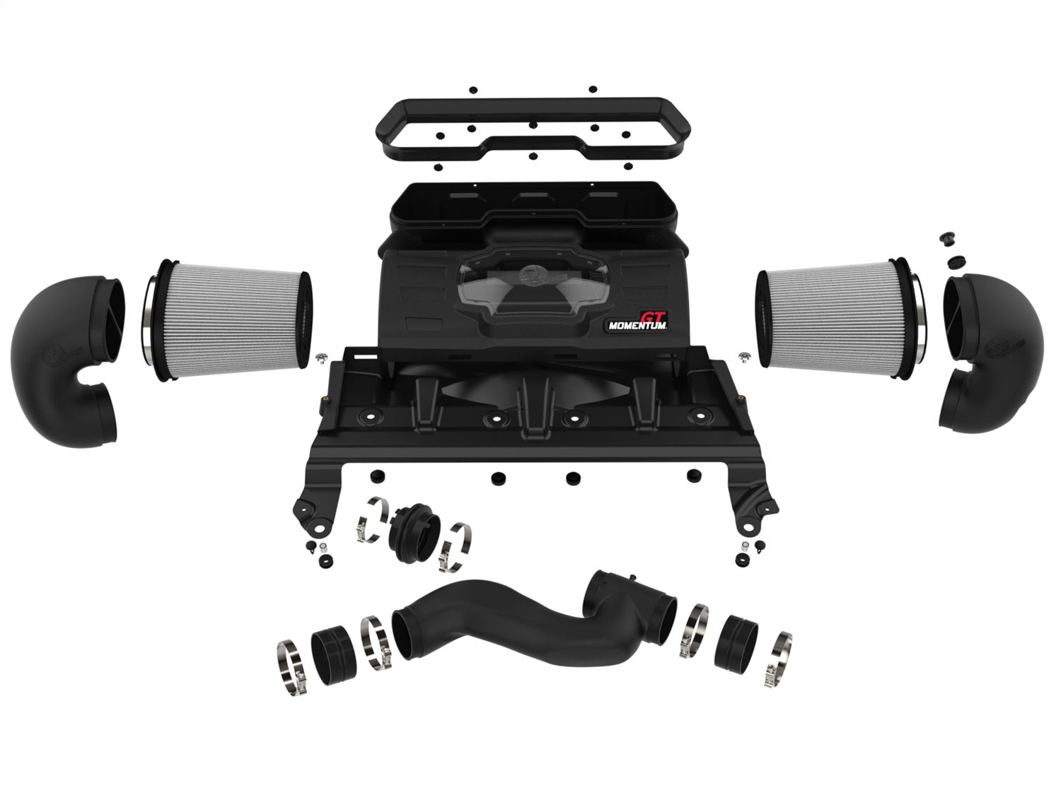A pair of 360-degree radial flow air filters feature our oil-free Pro DRY S media with three layers of synthetic media for maximum convenience. The progressive layering provides great filtration efficiency and dust holding capacity, while not requiring the use of oils. This media is best suited for street and light off-road use. The inverted tops makes for more filter surface area, resulting in longer service intervals. Momentum’s innovative filter-to-housing interface was built to feature the largest air filter possible. Once the system is installed, the air filters can be easily removed from the housing for maintenance by only uninstalling the side intake tubes. The smooth one-piece sealed housing, constructed of heat-resistant cross-linked polyethylene (XLPE), features our patent pending filter-to-housing interface. Its innovative design minimizes the total number of parts, making for an easy installation. A massive clear sight window allows for hassle-free filter inspection without having to disassemble your intake system. The housing incorporates both the factory hood air inlet scoop and the grille inlet using no additional hardware. This system features a trio of high quality, computer-designed, dyno-tuned intake tubes to achieve maximum power gains while maintaining a perfect fit. Our XLPE material is heat soak resistant and extremely durable. Stainless-steel clamps are included for strength, and a premium silicone coupling allows for ample flexibility and durability. Momentum GT intakes are designed with fewer parts for a fast and easy installation.