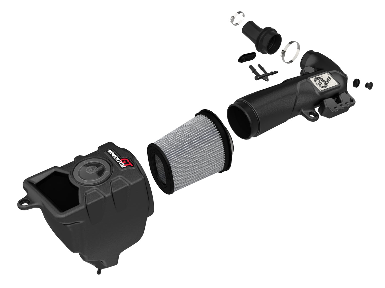 Eliminates the use of multiple components and ensures the coolest air intake charge available. A clear sight window allows for filter inspection without removal of the airbox. The roto-molded housing is made of heat soak resistant cross-linked polyethylene. The housing is designed to retain the same water fording height as the factory intake system while providing more air flow and better protection. This system uses a CAD designed, dyno-tuned, roto-molded intake tube to achieve maximum power gains while maintaining a perfect fit. The roto-molded tube has a built-in resonance chamber to suppress any unwanted air intake noises. This Momentum GT intake system was designed around the largest filter possible to allow maximum performance and filtration. This filter has a massive 5 IN round flange and is 8 IN tall with an inverted top and features our non-oiled Pro DRY S media. The Pro DRY S performance air filter features 3-layers of progressively finer porosity synthetic media that does not require oil providing maximum convenience. The unique air filter to housing interface (patent pending) allows for maximum filter size which increases the available air volume while simplifying the installation process. Premium stainless-steel clamps are used for durability and provide the best corrosion resistance possible. Momentum GT intakes are designed with fewer parts for a quick and simple installation.