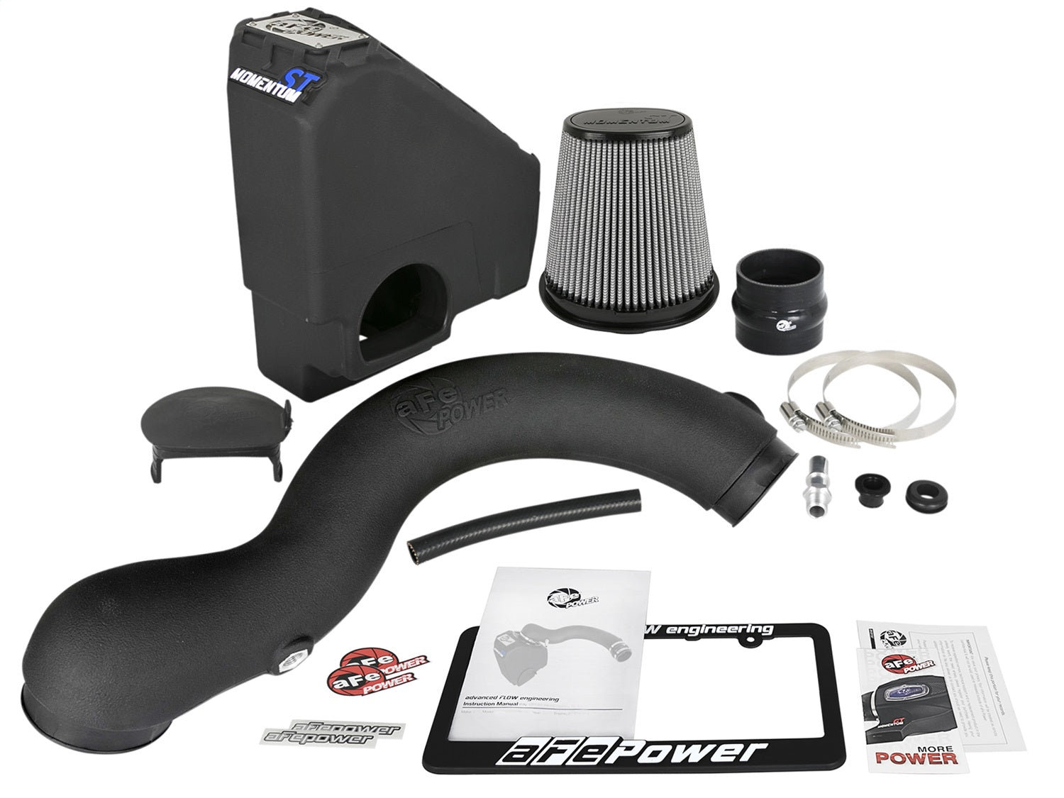 Unique One-Piece Sealed Housing: The smooth one-piece sealed housing with auxiliary air scoop is used to eliminate the use of multiple-piece housings and ensure the coldest air intake charge available. A urethane plug is also included if you wish to completely seal the auxiliary air scoop. High Quality Tube: This system uses a high quality plastic CAD designed, dyno-tuned, roto-molded intake tube to achieve maximum power gains while maintaining a perfect fit. Large 5-Layer Performance Air Filter: This Momentum ST intake system was designed around the largest filter possible to allow maximum performance and filtration. This cone filter has a massive round flange and is 8" tall inverted top Pro 5R filter media. The Pro 5R performance air filter features 5-layers of progressively finer mesh cotton gauze oiled media and is constructed with 100% polyurethane frame for long life and multiple cleaning cycles. Premium Hardware: Premium stainless steel T-bolt clamps and a silicone coupler at the throttle body is used for strength and durability while also providing the most secure installation available. Momentum ST intakes are designed with fewer parts for a quick and simple installation.