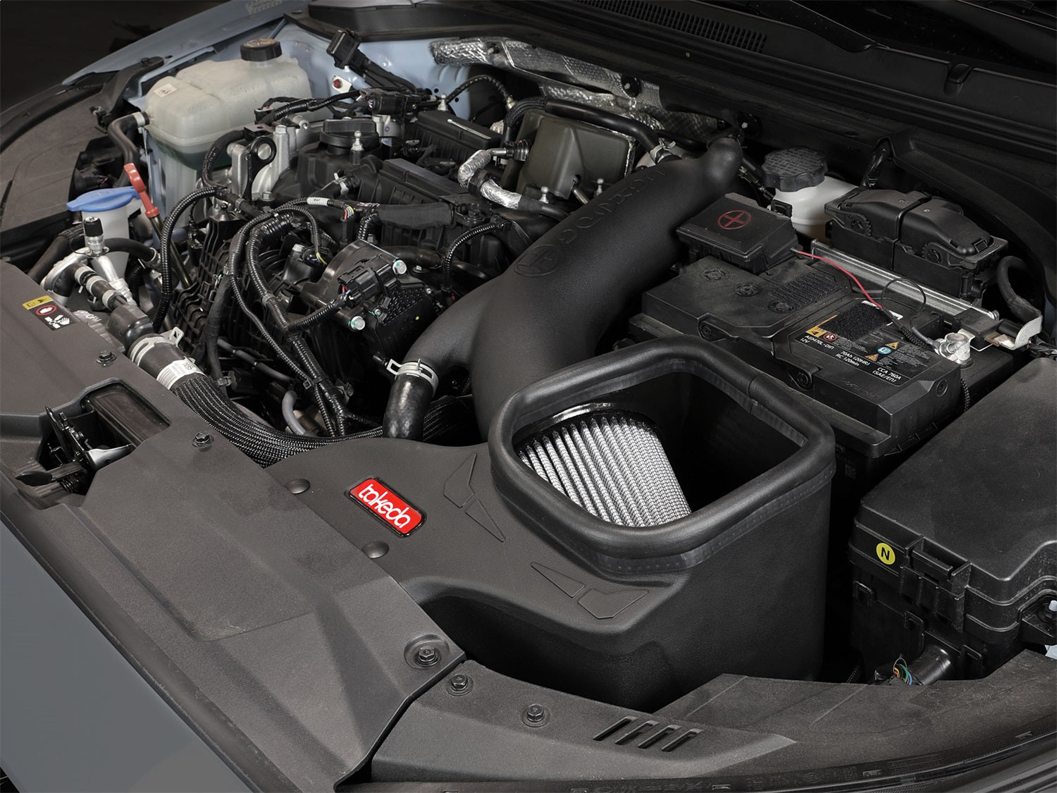 Large Three Layer Performance Air Filter: This 360-degree radial flow air filter features a 4" flange and our oil-free Pro DRY S media with three layers of synthetic media for maximum convenience. Its progressive layering provides great filtration efficiency and dust holding capacity, while not requiring the use of oils. This media is best suited for street use. Its inverted top makes for more filter surface area, resulting in longer service intervals. Dyno-Tuned Intake Tube: This system features a high quality, computer-designed, dyno-tuned intake tube to achieve maximum power gains while maintaining a perfect fit. Its XLPE material is heat soak resistant and extremely durable. It features a Takeda design inspired by import vehicles. One-Piece Housing: The included massive air filter is surrounded by an open-element XLPE (cross-linked polyethylene) polymer housing that minimizes warm engine air for maximum performance. Its open design allows for easy viewing of the air filter, yet creates a heat-blocking seal when the vehicle's hood is closed. It features an incorporated scoop to capture air from the front of the vehicle. Hassle-Free Installation: This is a direct fit intake system that utilizes factory mounting points and requires no cutting or modifications. All necessary clamps, couplings, and hardware are included. Its revolutionary design, featuring our patent pending filter-to-housing interface, uses half the number of parts of a traditional cold air intake system. Included billet aluminum fittings allows stock connections to transfer over seamlessly.