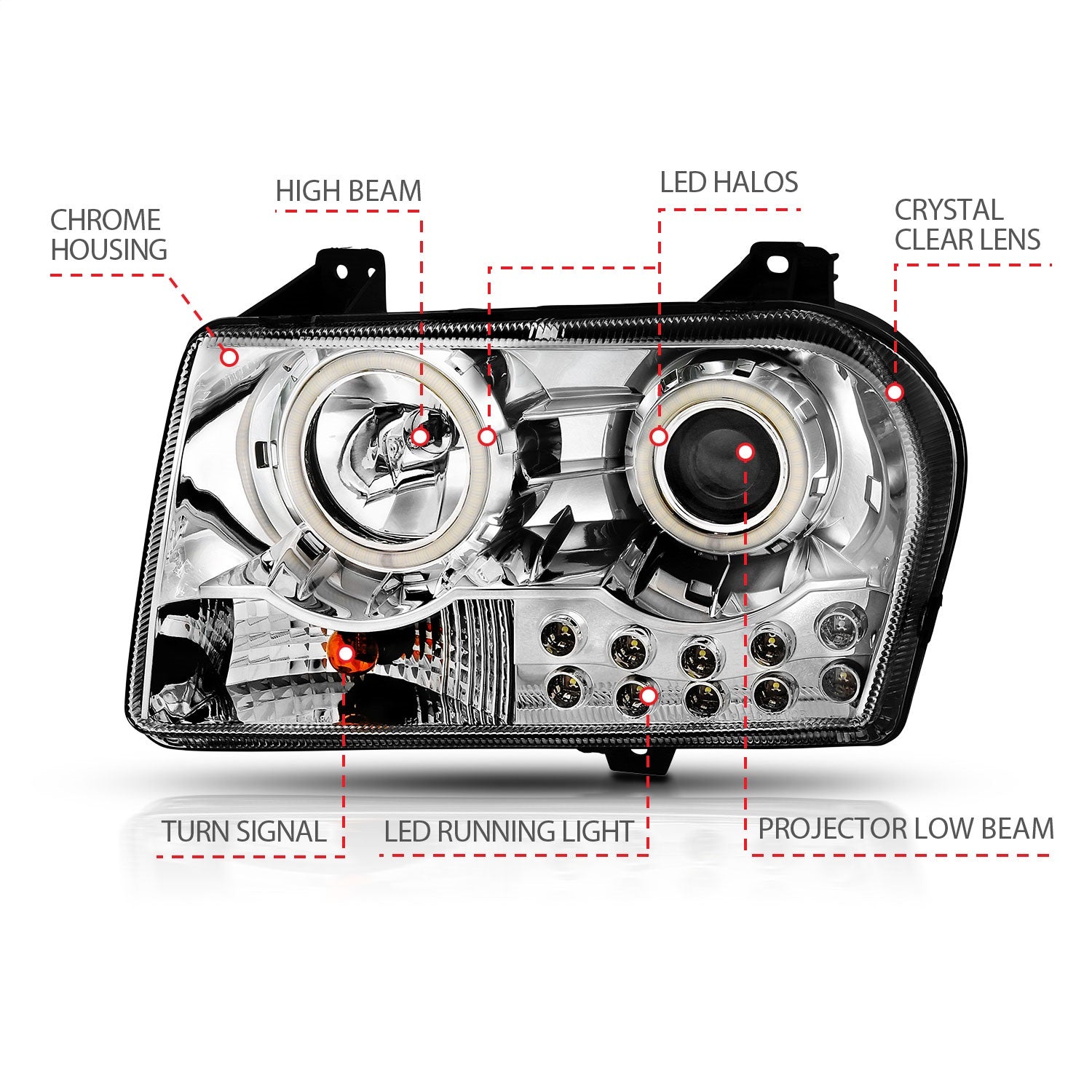 Projector Headlight Set, w/Halo, Clear Lens, Chrome Housing, Pair, . Guaranteed To Improve Your Vehicles Appearance. Rigorously Tested For Fit And Function. Simple Plug And Play. No Modifications Required. Easy Installation Using Common Hand Tools. Uses Stock Mounting Locations And Hardware. D.O.T. Compliant To S.A.E. Standards. Sold As A Pair. Does Not Fit 300C Or SRT-8 Models.