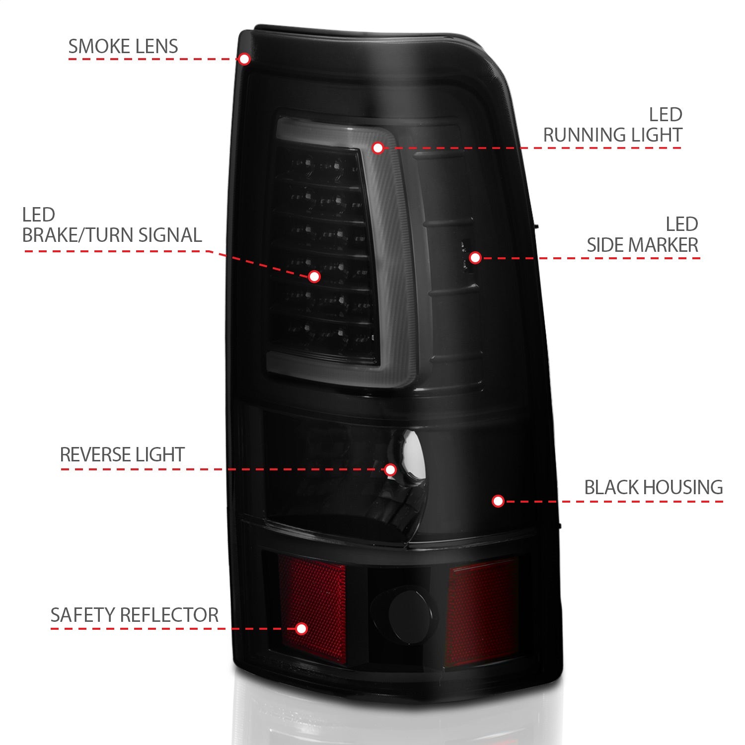 Tail Light Assembly, LED, Smoke Lens, Pair, Plank Style Design. Guaranteed To Improve Your Vehicles Appearance. Rigorously Tested For Fit And Function. Simple Plug And Play. No Modifications Required. Easy Installation Using Common Hand Tools. Uses Stock Mounting Locations And Hardware. D.O.T. Compliant To S.A.E. Standards. Sold As A Pair.
