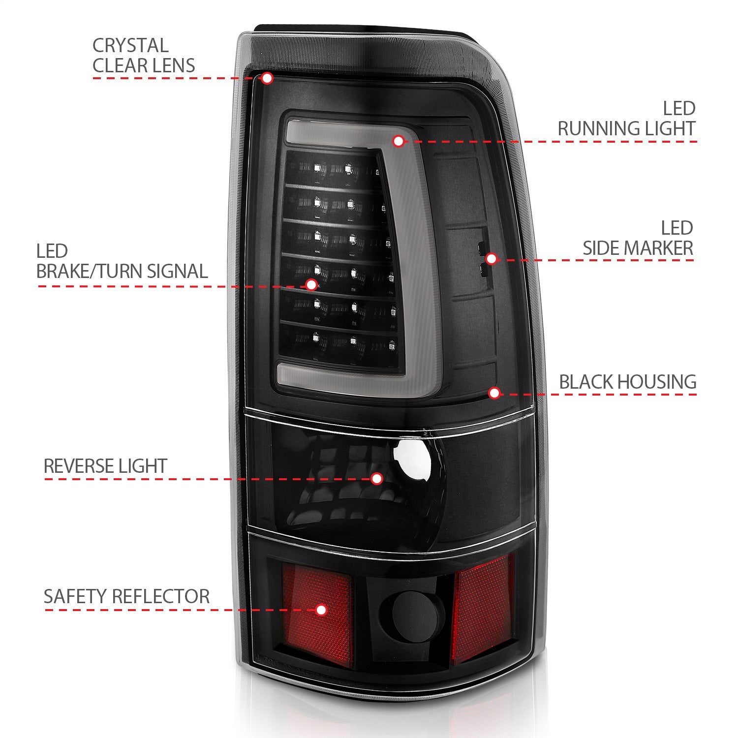 Tail Light Assembly, LED, Clear Lens, Black Housing, Pair, Plank Style Design. Guaranteed To Improve Your Vehicles Appearance. Rigorously Tested For Fit And Function. Simple Plug And Play. No Modifications Required. Easy Installation Using Common Hand Tools. Uses Stock Mounting Locations And Hardware. D.O.T. Compliant To S.A.E. Standards. Sold As A Pair.