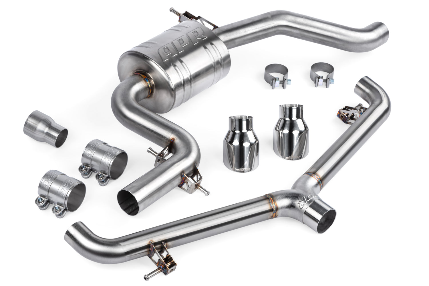 The APR Catback Exhaust System personalizes your vehicle's looks, sound and performance. Beautifully hand-crafted T304-stainless-steel components adorn the system with stunning TIG-welding throughout. Our straight-through brushed-finished mufflers are configurable to your desire, smoothing the exhaust note to a deep growl, without adding restrictions, rasp or drone. Strong high-quality bracketry and OEM-style clamps hold the system steadily in place, making the install or removal a snap, and fitment simple, yet precise. A cast 3 in. to dual 2.5 in. rear splitter creates an ultra-smooth transition, steadily feeding exhaust gasses out of the system, while looking tidy from under the rear bumper. Finally, removable 4 in. polished slash-cut exhaust tips finish the system, adding a classy motorsport-inspired touch to the rear of the vehicle.