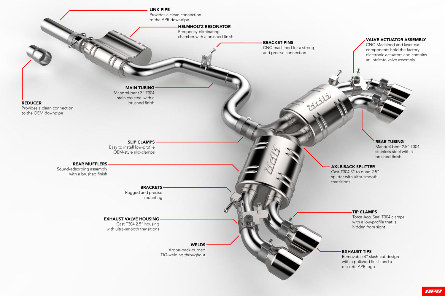 The APR Catback Exhaust System personalizes your vehicle's looks, sound and performance. Beautifully hand-crafted T304-stainless-steel components adorn the system with stunning TIG-welding throughout. Our straight-through brushed-finished mufflers smooth the exhaust note to a deep growl, without adding restrictions, while our Helmholtz resonator reduces unwanted frequencies. Strong high-quality bracketry and OEM-style clamps hold the system steadily in place, making the install or removal a snap, and fitment simple, yet precise. A cast 3" to quad 2.5" rear splitter creates an ultra-smooth transition, steadily feeding exhaust gasses out of the system, while looking tidy from under the rear bumper. Our cast valve housings enable the vehicle to be fitted with the factory electronic valve actuators, retaining OEM valve operation. Finally, removable 4" polished slash-cut exhaust tips finish the system, adding a classy motorsport-inspired touch to the rear of the vehicle.