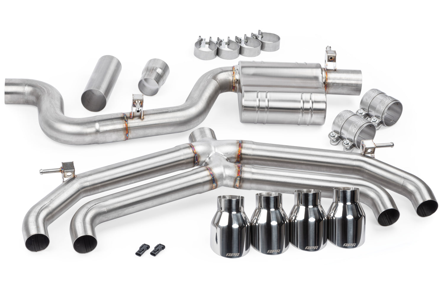 The APR Catback Exhaust System personalizes your vehicle's looks, sound and performance. Beautifully hand-crafted T304-stainless-steel components adorn the system with stunning TIG-welding throughout. Our straight-through brushed-finished mufflers are configurable to your desire, smoothing the exhaust note to a deep growl, without adding restrictions, rasp or drone. Strong high-quality bracketry and OEM-style clamps hold the system steadily in place, making the install or removal a snap, and fitment simple, yet precise. A cast 3 in. to dual 2.5 in. rear splitter creates an ultra-smooth transition, steadily feeding exhaust gasses out of the system, while looking tidy from under the rear bumper. Finally, removable 4 in. polished slash-cut exhaust tips finish the system, adding a classy motorsport-inspired touch to the rear of the vehicle.