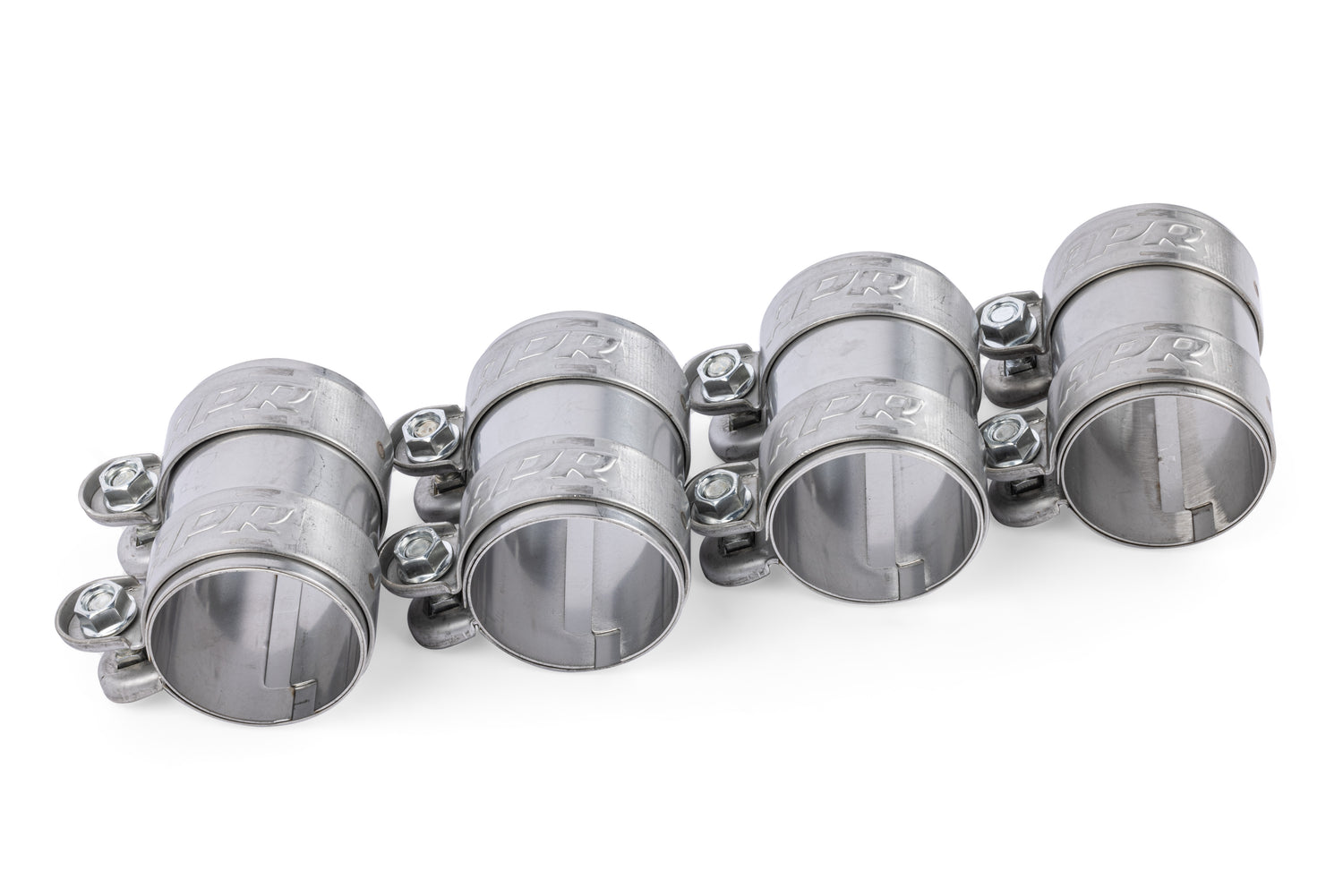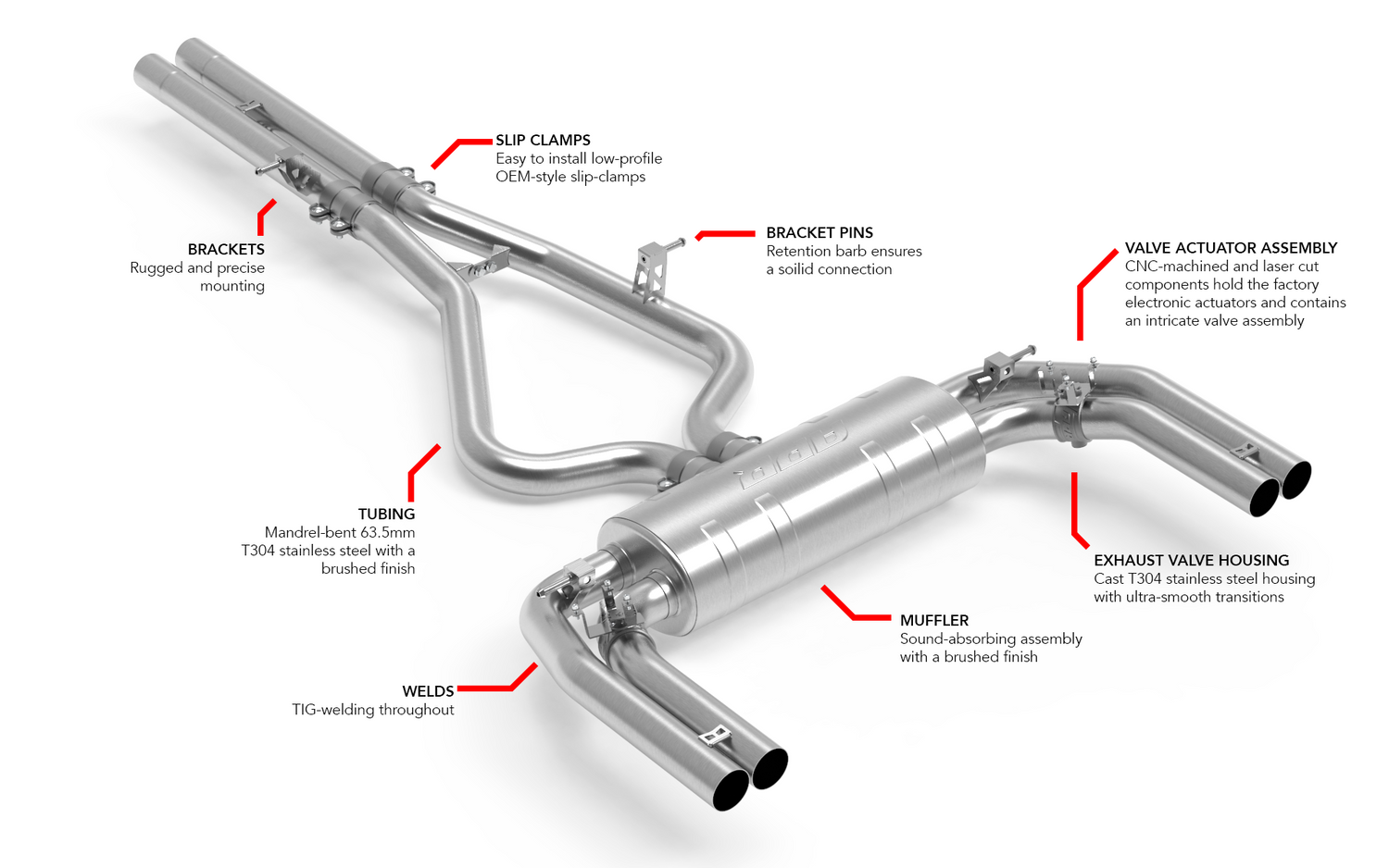 The APR Catback Exhaust System personalizes your vehicle's looks, sound and performance. Beautifully hand-crafted T304-stainless-steel components adorn the system with stunning TIG-welding throughout. Our straight-through brushed-finished mufflers smooth the exhaust note to a deep growl, without adding restrictions or rasp. Strong high-quality bracketry and OEM-style clamps hold the system steadily in place, making the install or removal a snap, and fitment simple, yet precise. Dual 2.5" mandrel-bent exhaust paths provide an ultra-smooth path, steadily feeding exhaust gasses out of the quad exit system, while looking tidy from under the rear bumper. Our cast valve housings enable the vehicle to be fitted with the factory electronic valve actuators, retaining OEM valve operation for variable sound levels. Finally, our quad exit exhaust tubes exit the system into the beautiful factory RS bumper integrated exhaust tips