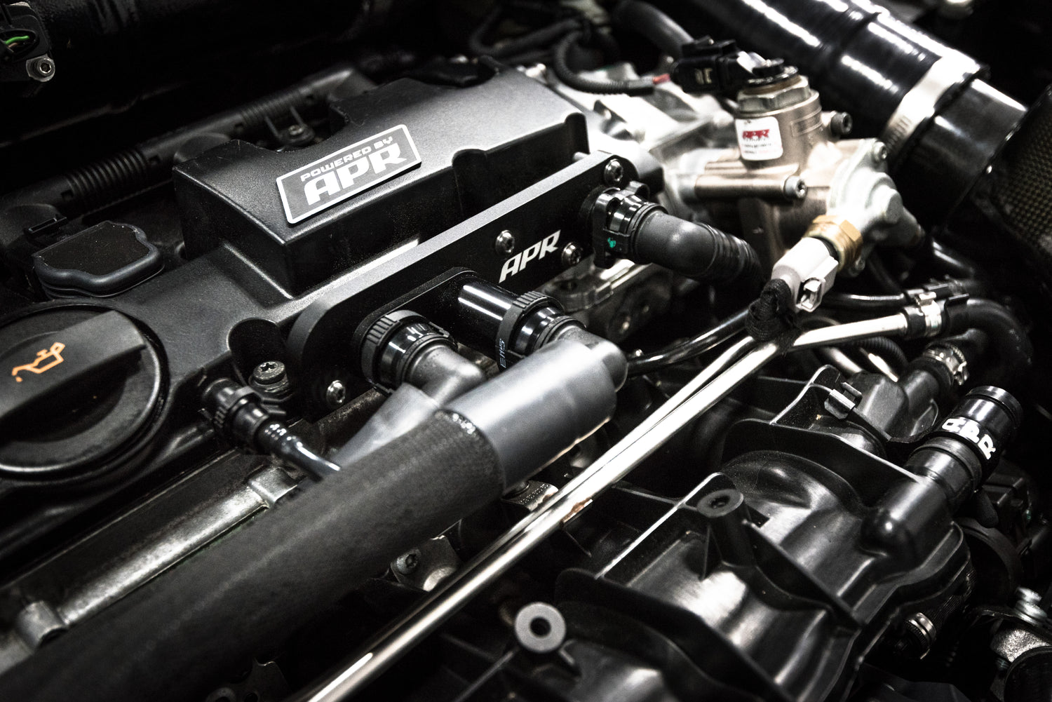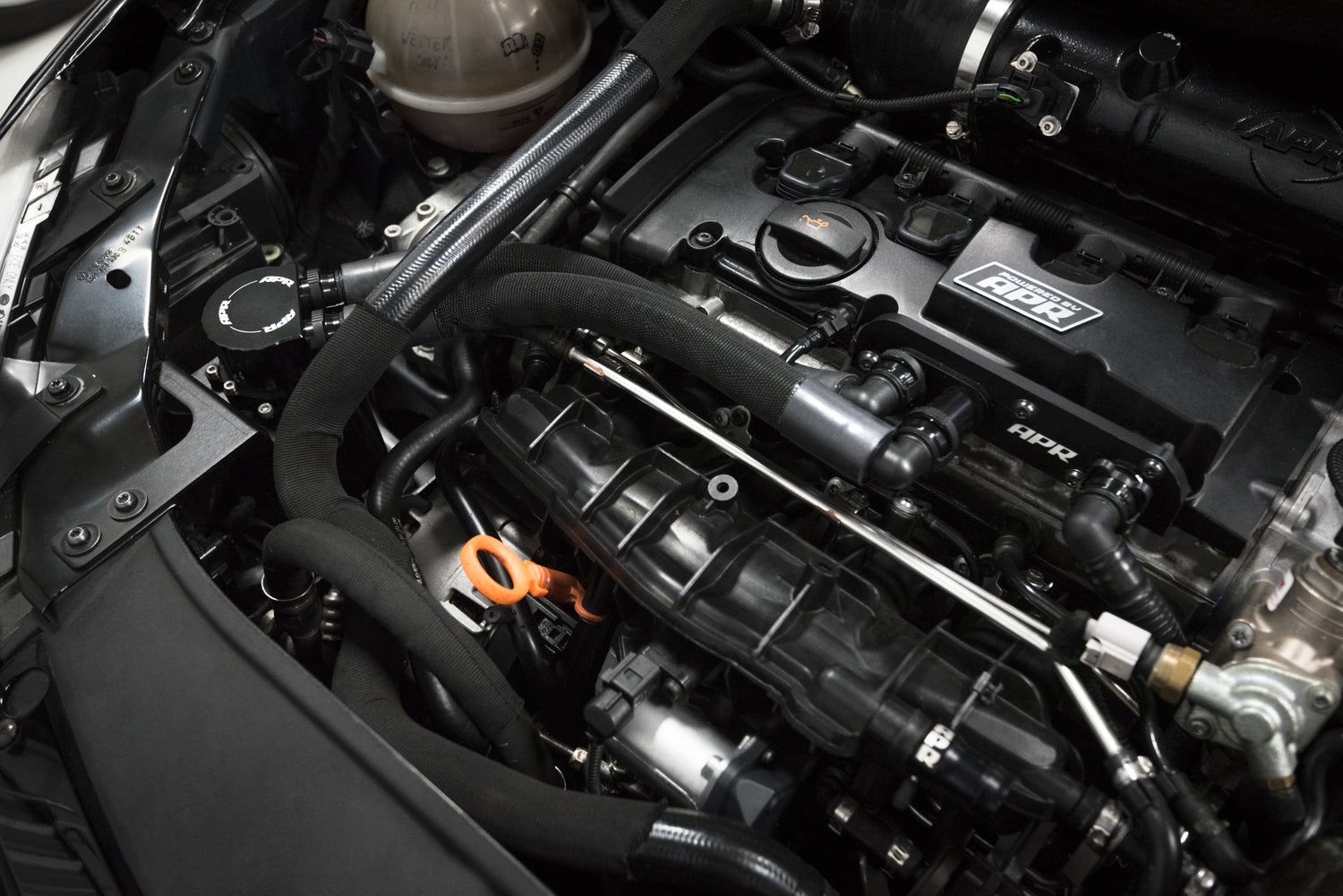 The APR Oil Catch Can System replaces the failure prone factory positive crank ventilation (PCV) system and traps excessive crankcase oil vapors and gunk from entering the engine. The system eliminates a common performance robbing boost leak, while reducing carbon buildup on intake valves, octane lowering oil vapors and oil pooling within the intake tract. It's a simple modification to install, drains in seconds with the flick of a knob, and is recommended at all stages of performance.