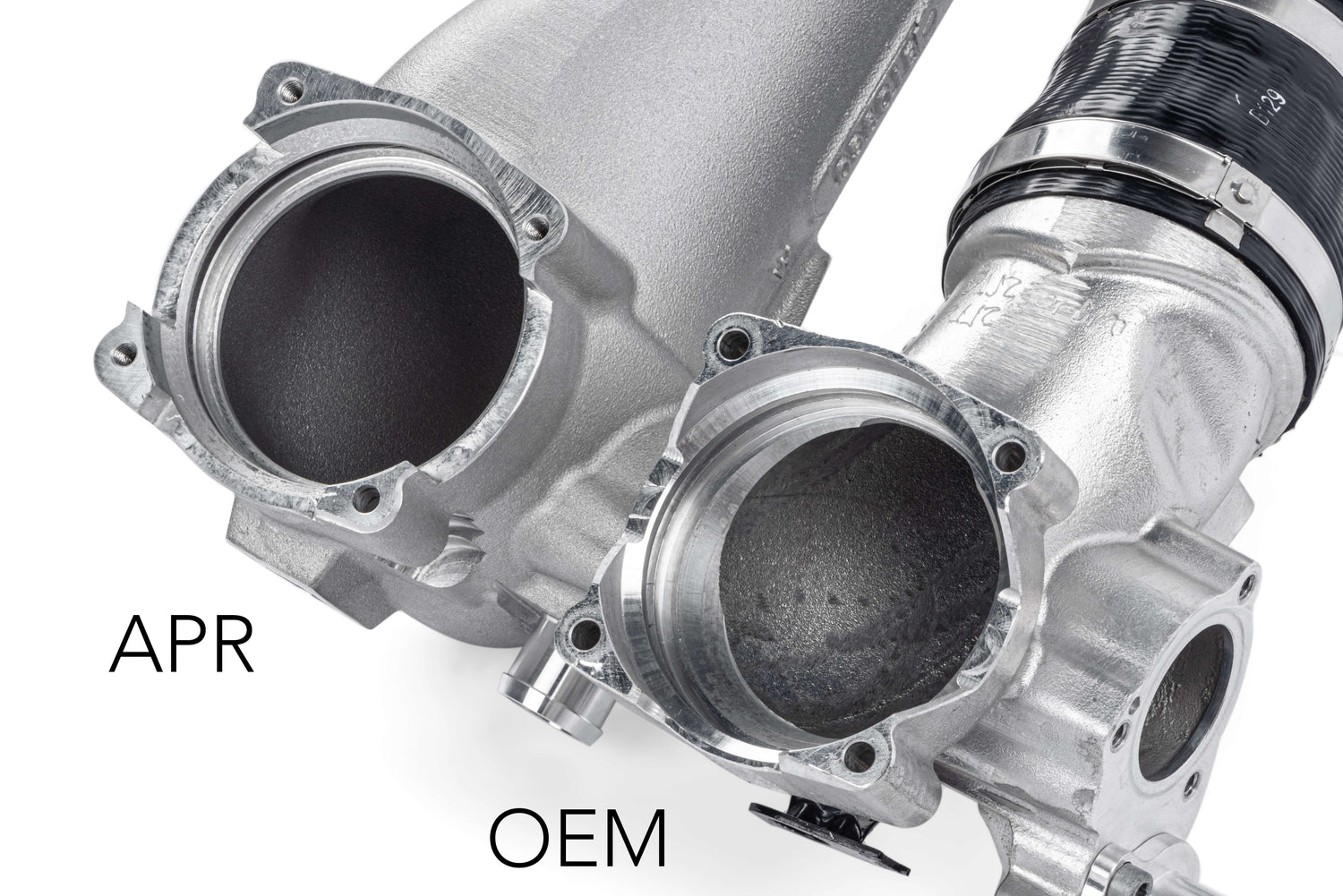 The APR Throttle Body Inlet System is a comprehensive upgrade to the factory charge pipe system from the Intercooler outlet to the throttle body. We replace all components and provide a new, larger, free flowing system that flows roughly 34% more than stock! This was achieved by increasing the cross sectional area of the system and by reducing the tight radius bend directly in front of the throttle body. Our system does away with two potential boost leak points thanks to our single cast design. Eve upgraded the factory rubber Intercooler outlet hose to a multi-ply wire-reinforced silicone design with strong t-bolt clamps that resist boost leaks better than their stock counterparts. Our new billet throttle body to manifold adapter provides a convenient boost and vacuum reference point which can be used for a gauge, or anything else in that suits your build. Lastly the system comes complete with new throttle body and intake manifold gaskets, which are common problematic leak point many never know to address. This comprehensive system is much larger than stock thanks to the sweeping design of the cast inlet pipe, and oversized silicone hose. However, despite being dramatically larger than stock, the complete system is a negligible 2.4 lbs over stock! Simply put, the APR system is a complete upgrade from start to finish, flows better than stock and our competition, and is the only throttle body inlet system you'll ever need!