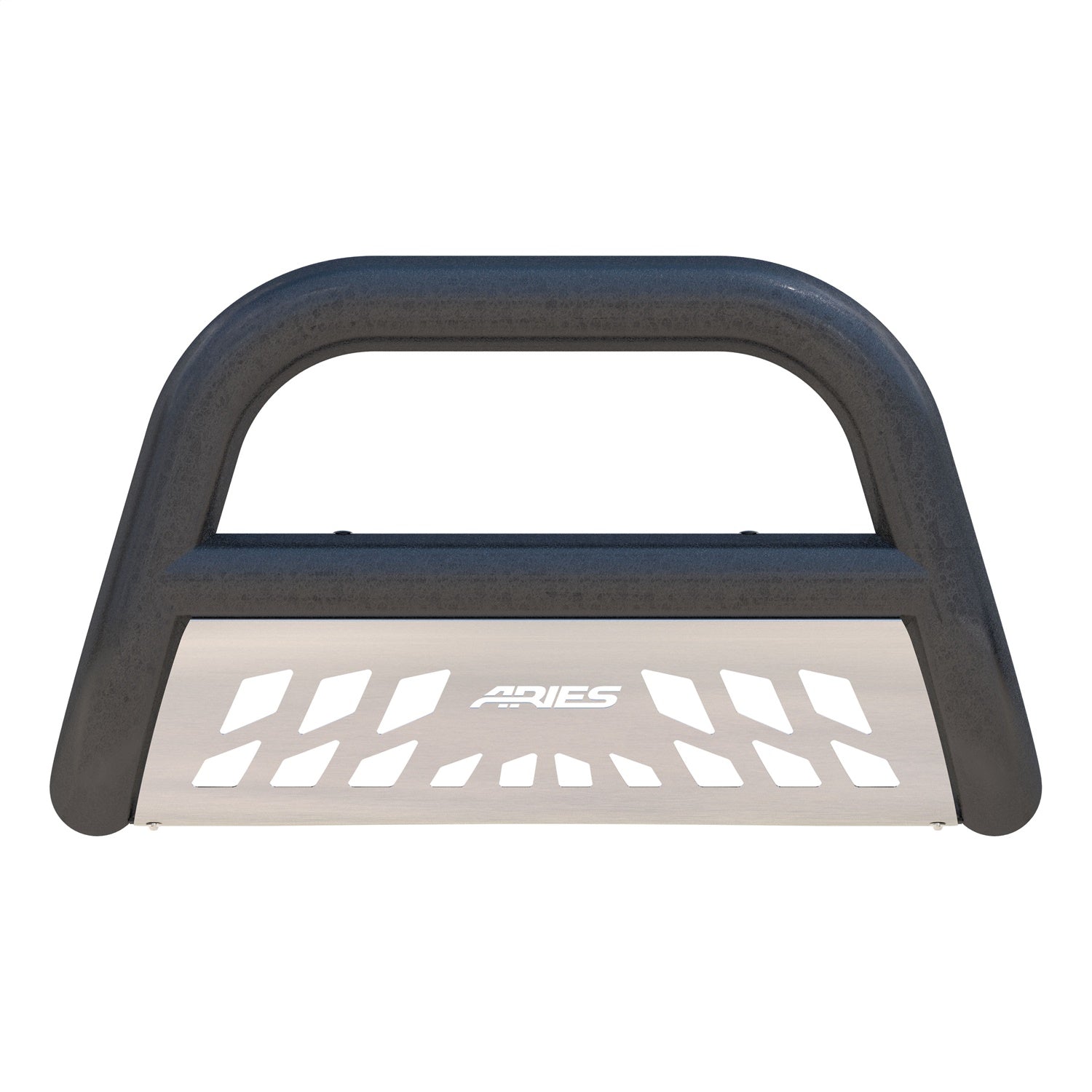 Nothing says bad to the bone like the ARIES Big Horn 4" bull bar. This front-end giant boasts a hefty 4" diameter tube to give your truck a bold look with the toughness to back it up. It is constructed from aluminum alloy to be strong, lightweight and rust-free, and it is covered in a highly durable textured black powder coat finish. This tough finish is uniquely designed to hide minor scratches and grime, and it easily resists chipping and peeling. This bull bar is also available in a polished stainless steel finish to give you the freedom to customize the look of your truck. Each Big Horn bull bar offers easy customization options with its pre-drilled light mounting holes. The crossbar features two mounting points to accept an LED light bar or two LED work lights. The bull bar is also equipped with a brushed stainless steel skid plate. The skid plate is made from highly rust-resistant 304 stainless steel and protects against loose gravel and other small road debris. It comes with an aggressive ARIES-exclusive cutout and can also be removed for a customized look. Made to complement our Big Step side bars, the Big Horn bull bar is perfect for lifted trucks, diesels and full-size pickups. Not only does it provide a bold, aggressive look, but it is also made to fit your vehicle perfectly. Each one features a unique bend that accents the shape and contour of a specific front-end application. Our 4" bull bar is also equipped with vehicle-specific mounting brackets. This allows it to be installed quicker, fit better on the vehicles frame and eliminates the need for drilling. It uses pre-existing factory holes in the frame to cut down on installation time and add rigidity.