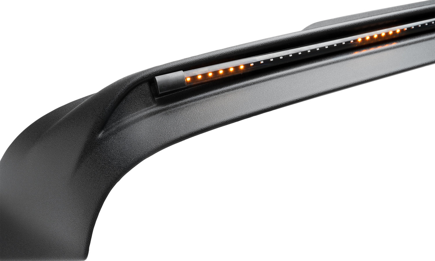 Road warriors, overlanders, and daily drivers unite! AVS has made it easier than ever to light up the trail or illuminate the night with their Aeroskin LightShield Pro. It's the first hood shield featuring fully integrated amber LED running lamps with multiple light output sequences for added ?ash and function. Its curved, aerodynamic design creates a powerful upstream of air that sweeps bugs, dirt, and road debris up and away from your vehicle, leaving your hood looking showroom-?oor-new. The single-piece construction uses UV-resistant Dura-Flex 2000 TPO material, so it bends without breaking, ?exes without cracking, and never discolors from the sun. The 3M automotive-grade adhesive makes installation fast and easy -- no tools or special hardware required. Available in a textured matte black finish. Proudly made in the USA with global materials.