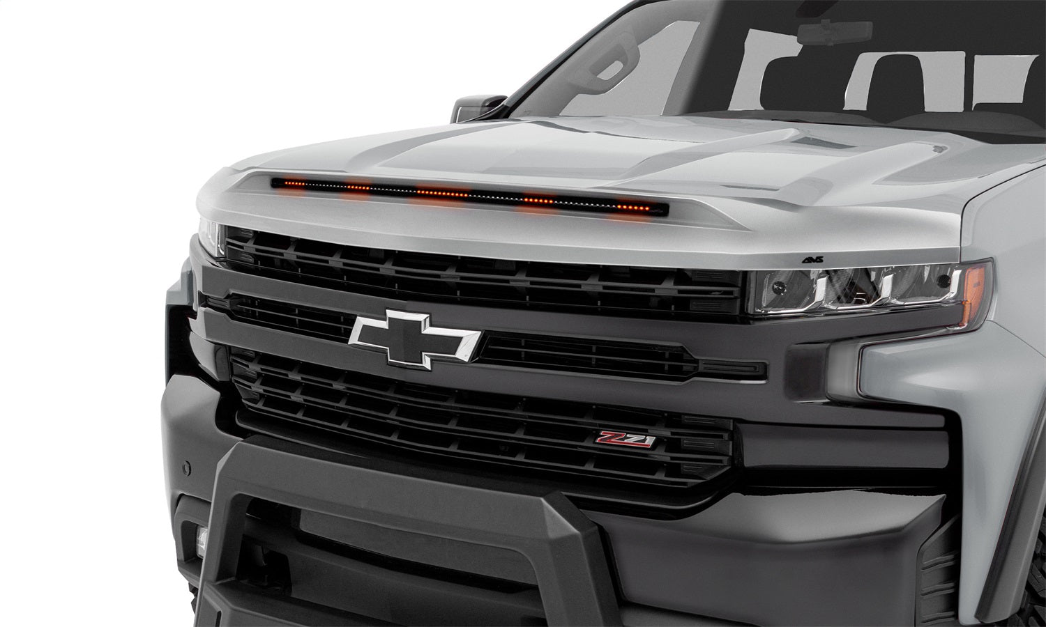 Light up your hood and your truck's appearance with the Aeroskin (R) LightShield(TM) Pro Color-Match Hood Protector. It's a seamless match to your OEM paint - more than a match for anything on the road. It's the first hood shield featuring fully integrated amber LED running lamps with multiple light output sequences for added ?ash and function. The Aeroskin(R) Lightshield(TM) Pro Color-Match features a curved, aerodynamic design creates a powerful upstream of air that sweeps bugs, dirt, and road debris up and away from your vehicle, leaving your hood looking showroom-?oor-new. The single-piece construction uses UV-resistant Dura-Flex 2000 TPO material, so it bends without breaking, ?exes without cracking, and never discolors from the sun. The 3M automotive-grade adhesive makes installation fast and easy - no tools or special hardware required. Proudly made in the USA with global materials.