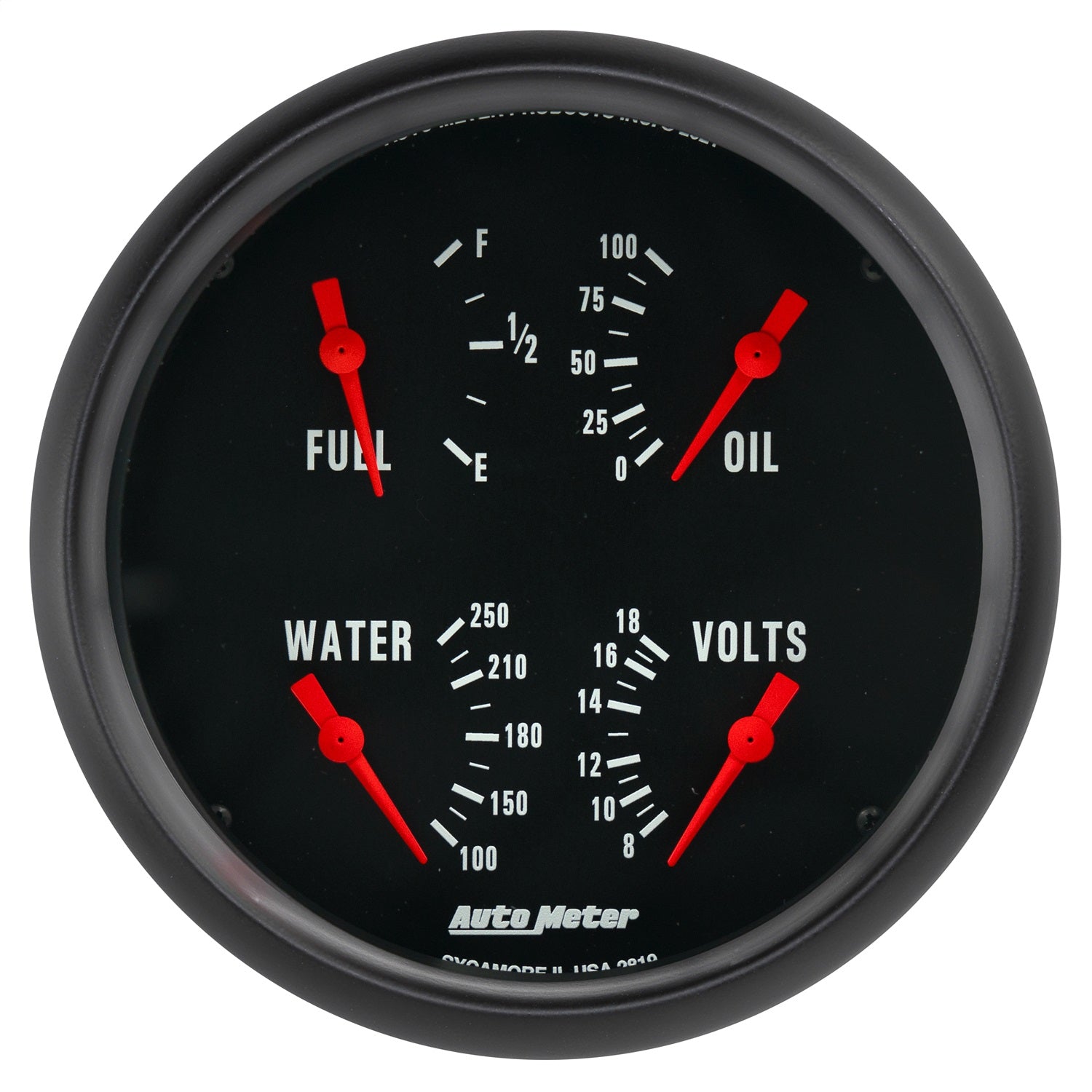 Sometimes space is limited. The AutoMeter Quad Gauge provides a solution to limited dashboard space while providing a clean look. Individual AutoMeter air core meter movements for each function provide the accuracy and durability required by even the most demanding applications. Includes a single wire 1/8 in. NPT temperature sender and a 1/8 in. NPT oil pressure sender. The voltmeter reads from 8-18v on negative ground electrical systems and fuel level resistance range is 240 ohms empty to 33 ohms full (compatible with AutoMeter's 3262 fuel level sender).