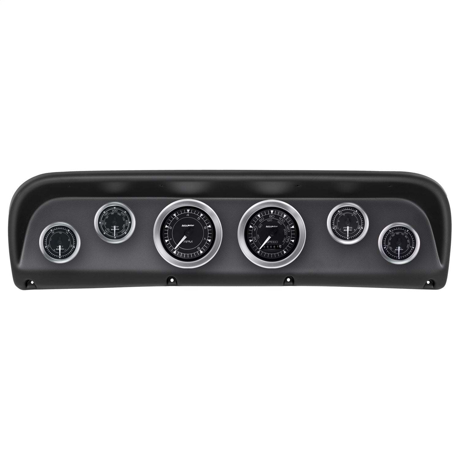 Upgrade your classic 1967-1972 5th Generation Ford Ranger F Series Truck with an AutoMeter gauges direct-fit Chrono dash kit. This easy-to-install package includes a durable replacement dash panel finished in black containing six stunning Chrono gauges featuring timepiece inspired three dimensional dials and clear anodized polished aluminum bezels. Cool white LED through dial lighting ensures optimal visibility during low-light conditions while full sweep race proven movements provide maximum accuracy and resolution. Easy, no fab installation preserves the original interior of your classic ride.