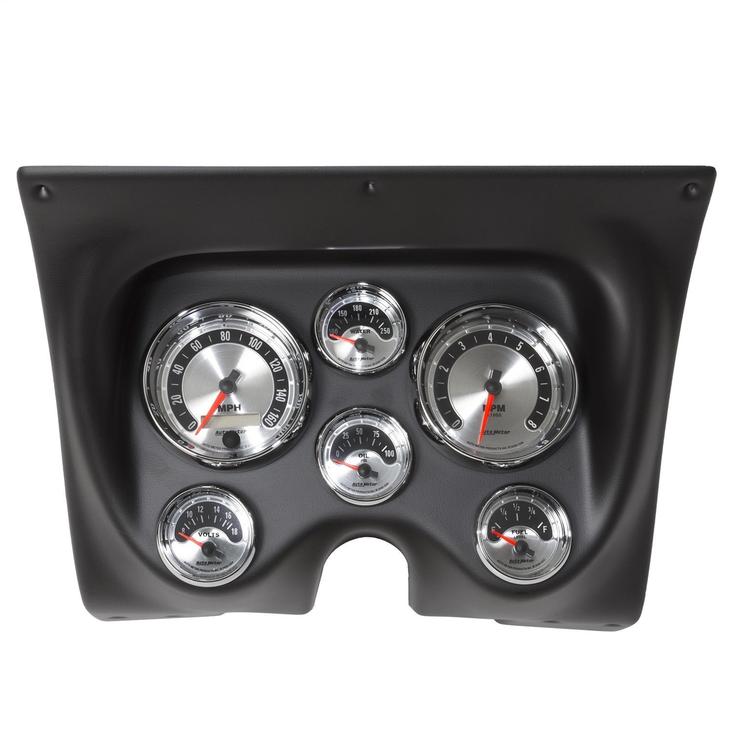 Includes 3-3/8" American Muscle electric speedometer & tachometer and 2-1/16" electric fuel level (0/90 ohm), water temperature, oil pressure, and voltmeter