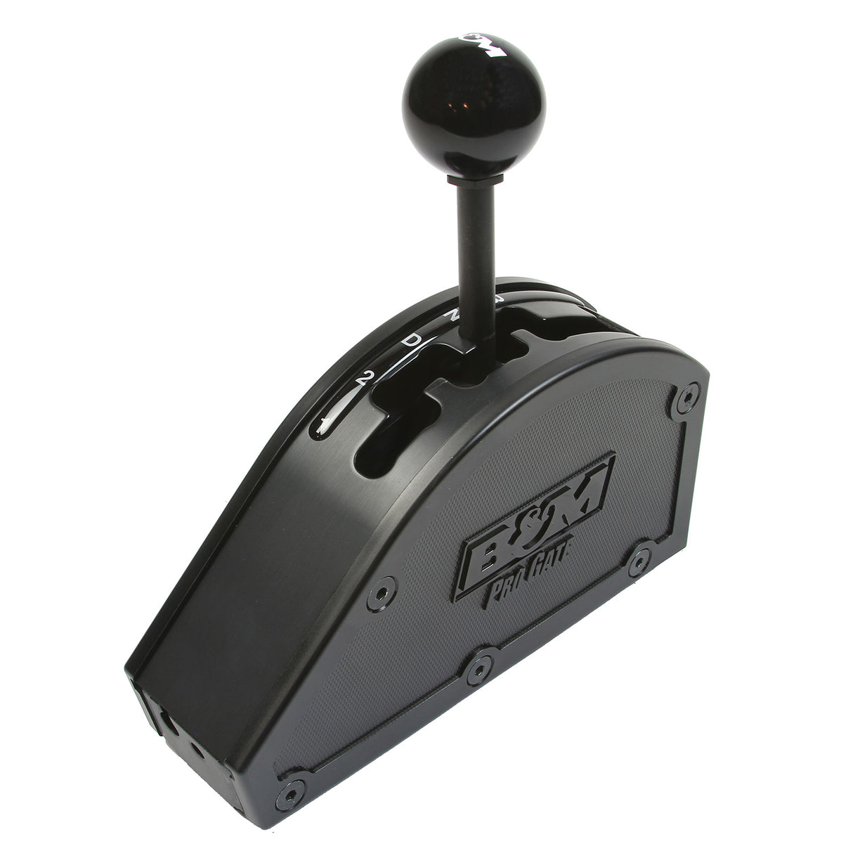 The B&M Pro Gate shifter is an externally gated race shifter for GM 3-speed automatic transmissions. The compact and lightweight design features a 10-gauge black oxide coated 304 stainless steel base with a heavy-duty 303 stainless steel shift pin for longevity and bullet-proof performance. The 1016 steel shift stick includes a black B&M logo shift knob for shifting duties while the external gate plate is constructed from black oxide coated 11-gauge 304 stainless steel for durability. The 3-speed gated forward shift pattern features a staggered shift pattern with positive stops between each gear for easy and precise shifts. Other features include thick injection-molded nylon side covers featuring a knurled texture with the B&M Pro Gate logo on both sides. The covers are removable for access to the virtually maintenance-free shifter sub-assembly and will not gum up with dirt affecting shift performance, which is ideal for Off-Road racing. The rear exit cable design includes a black 5-ft Super Duty race shifter cable along with a cable bracket, shift lever and all necessary hardware for a straight forward installation. Includes Lifetime Limited Warranty. Overall Dimensions - 9.1L x 2.6W x 9.5H