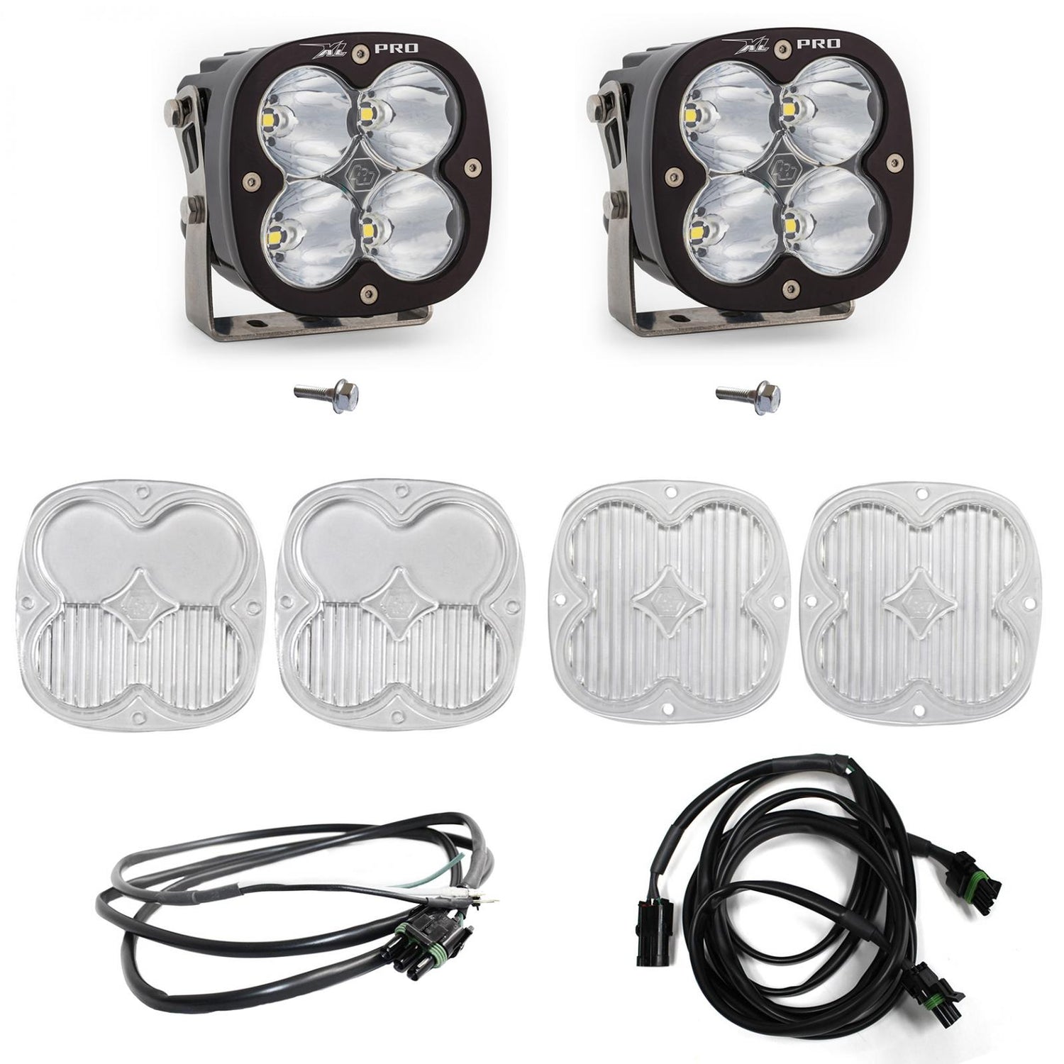This lighting kit includes a pair of XL Pro LED auxiliary lights in spot, along with a set of wide cornering, and wide cornering lenses in the case you would like to change the pattern to a more near-field orientation.